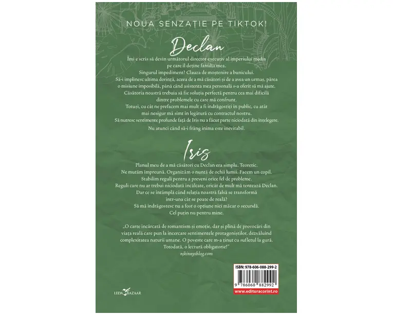 Declan Imi e scris sa devin urmatorul director executiv al imperiului media pe care il detine familia mea. Singurul impediment? Clauza de mostenire a bunicului. Sa-i implinesc ultima dorinta, aceea de a ma casatori si de a avea un urmas, parea o misiune imposibila, pana cand asistenta mea personala s-a oferit sa ma ajute. Casatoria noastra trebuia sa fie solutia perfecta pentru cea mai dificila dintre problemele cu care ma confrunt. Totusi, cu cat ne prefacem mai mult a fi indragostiti in public, cu atat mai nesigur ma simt in legatura cu contractul nostru. Sa nutresc sentimente profunde fata de Iris nu a facut parte niciodata din intelegere. Nu atunci cand sa-i frang inima este inevitabil. Iris Planul meu de a ma casatori cu Declan era simplu. Teoretic. Ne mutam impreuna. Organizam o nunta de ochii lumii. Facem un copil. Stabilim reguli pentru a preveni orice fel de probleme. Reguli care nu ar trebui niciodata incalcate, oricat de mult ma tenteaza Declan. Dar ce se intampla cand relatia noastra falsa se transforma intr-una cat se poate de reala? Sa ma indragostesc nu a fost o optiune nici macar o secunda. Cel putin nu pentru mine. „O carte incarcata de romantism si emotie, dar si plina de provocari din viata reala care pun la incercare sentimentele protagonistilor, dezvaluind complexitatea naturii umane. O poveste care m-a tinut cu sufletul la gura. Totodata, o lectura obligatorie!” „Autoarea propune o multime de teme dusmanii care se transforma in iubiti, diferenta de varsta relativ mare dintre partenerii de cuplu (24/36), iubirea care se infiripa la serviciu, casatoria de convenienta, tipul morocanos versus fata vesnic optimista , iar povestea isi pastreaza prospetimea si ritmul trepidant.” „Am ras. Am plans. M-am simtit grozav citind aceasta carte. […] Atat de multe momente memorabile!” „O poveste reusita, fara complicatii inutile, extrem de amuzanta si cu scene fierbinti!” Produsul cu denumirea Termene si conditii (vol.2 din Miliardarii de la Dreamland) face parte din brandul Corint, se afla in categoria Carti de sanatate si subcategoria