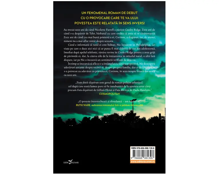 Un fenomenal roman de debut cu o provocare care te va ului: povestea este relatata în sens invers! Au trecut zece ani de când Nicolette Farrell a parasit Cooley Ridge. Zece ani de când s-a despartit de Tyler, barbatul cu care credea ca avea sa se casatoreasca. Zece ani de când cea mai buna prietena a ei, Corinne, a disparut, iar, de atunci, nimeni nu a mai aflat nimic despre aceasta. Când e informata ca tatal ei este bolnav, Nic locuieste în Philadelphia, iar viata pe care o duce aici nici ca ar putea fi mai diferita de cea din adolescenta. Imediat dupa apelul telefonic, tânara revine în Cooley Ridge pentru a avea grija de parintele ei, dar, la câteva zile de la întoarcerea în oraselul natal, o alta fata dispare, iar pe Nic o încearca un sentiment terifiant de déjà-vu. În timp ce încearca sa afle ce s-a întâmplat cu tânara respectiva, Nic descopera adevaruri socante despre vecinii ei, despre propria familie, dar si despre ceea ce s-a petrecut cu adevarat cu prietena ei, Corinne, în acea noapte bizara din urma cu zece ani. „Toate fetele disparute este genul de roman politist arhetipal, cel dupa care toata lumea pare sa fie înnebunita de la aparitia unor carti precum Fata disparuta de Gillian Flynn si Fata din tren de Paula Hawkins.” COSMOPOLITAN „O poveste întortocheata si obsedanta – am adorat-o!” RUTH WARE, autoarea romanului Într-o padure întunecata „Personajele principale ale autoarei îsi revendica dreptul de a fi mai mult decât victime sau femei fatale. […] Una dintre cele mai bune carti ale anului!” LOS ANGELES REVIEW OF BOOKS „Toate thrillerele captivante (hai sa ne gândim la: Cea mai norocoasa fata, Fata din tren, Fata disparuta) într-unul singur.” SKIMM „O intriga complicata! […] Megan Miranda creeaza un suspans sporit si rasturnari de situatie, spunând povestea, care se desfasoara pe parcursul a 15 zile, în ordine cronologica inversa.” THE NEW YORK TIMES „Povestit într-un ritm rapid si înspaimântator, romanul Toate fetele disparute te va învata de ce este periculos sa mergi singur noaptea prin padure.” REFINERY29 „Esti atent? Va trebui sa fii; acest thriller îti va pune mintea la încercare cu structura sa cronologica inversa si va fi o adevarata provocare sa tii sirul evenimentelor.” ELLE Produsul cu denumirea Toate fetele disparute face parte din brandul Corint, se afla in categoria Carti de sanatate si subcategoria