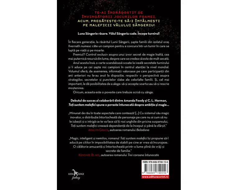 TE-AI INDRAGOSTIT DE INVINGATORII JOCURILOR FOAMEI. ACUM, PREGATESTE-TE SA-I INTALNESTI PE MALEFICII VALULUI SANGERIU! Luna Sangerie rasare. Valul Sangeriu cade. Incepe turnirul! In fiecare generatie, la rasaritul Lunii Sangerii, sapte familii din izolatul oras Ilvernath numesc cate un campion pentru a concura intr-un turnir in care se lupta pe viata si pe moarte. Premiul? Control exclusiv asupra unui izvor secret de magie inalta, cea mai puternica resursa din lume, despre care se credea ca este de mult secata. Anul acesta insa, o carte scandaloasa scoate la iveala secretele turnirului si ii aduce pe cei sapte noi campioni in centrul atentiei la nivel mondial. Volumul ofera, de asemenea, informatii valoroase pe care participantii din anii anteriori nu le-au avut la dispozitie, respectiv o perspectiva asupra strategiilor, secretelor si punctelor slabe ale celorlalte familii. Si, cel mai important, le da posibilitatea de a alege: sa-si accepte soarta sau sa-si rescrie mostenirea. Oricum, aceasta este o poveste care trebuie scrisa cu sange. Debutul de succes al colaborarii dintre Amanda Foody si C. L. Herman, Toti suntem malefici spune o poveste intunecata despre ambitie si magie… „Atat de impresionant, incat sfarsitul pe muchie de cutit va fi ca un blestem dureros!” Kirkus Reviews „Minunat de rau in toate aspectele care conteaza! […] Cu sistemul sau magic inovator, o distributie intortocheata de personaje pe care nu ai cum sa nu le iubesti si o intriga ce te va face sa iti rozi unghiile din pricina suspansului, Toti suntem malefici creeaza dependenta de la inceput si pana la sfarsit.” ADALYN GRACE, autoarea romanului Beladona „Magic, inteligent si nemilos, romanul Toti suntem malefici isi propune sa-l aduca pe cititor in imposibilitatea de stabili pe cine ar vrea sa incurajeze. O calatorie amuzanta si intortocheata printr-o lume plina de vraji si secrete de familie.” KENDARE BLAKE, autoarea romanului Trei coroane intunecate „Colaborarea dintre Foody si Herman ofera o poveste distractiva, dar brutala, despre sacrificii, tradare si loialitati in permanenta schimbare. De la rasturnari de situatie care te vor tine cu sufletul la gura pana la personaje cu defecte credibile pe care nu ai cum sa nu le incurajezi si sa le blestemi in acelasi timp, cartea aceasta ii va face pe cititori sa stea ca pe ace.” TARA SIM, autoarea romanului Scavenge the Stars Produsul cu denumirea Toti suntem malefici face parte din brandul Corint, se afla in categoria Carti de sanatate si subcategoria