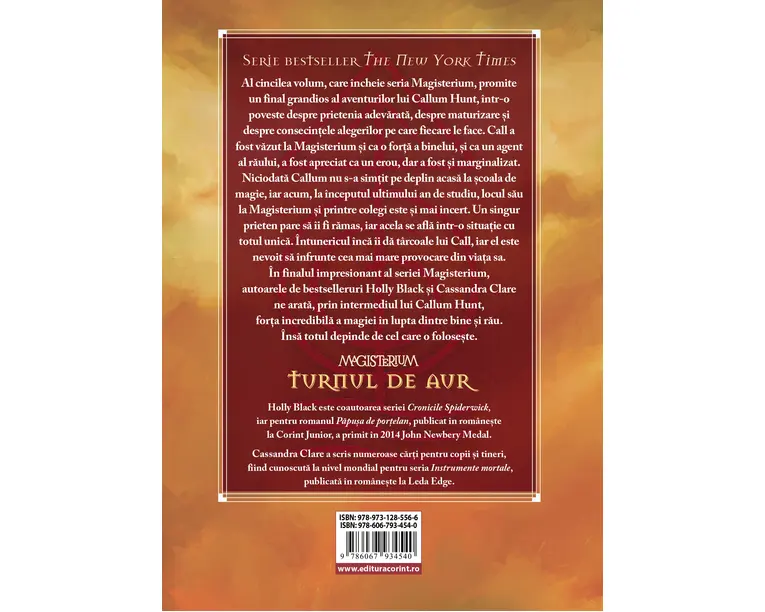 Al cincilea volum, care încheie seria Magisterium, promite un final grandios al aventurilor lui Callum Hunt, într-o poveste despre prietenia adevarata, despre maturizare si despre consecintele alegerilor pe care fiecare le face. Call a fost vazut la Magisterium si ca o forta a binelui, si ca un agent al raului, a fost apreciat ca un erou, dar a fost si marginalizat. Niciodata Callum nu s-a simtit pe deplin acasa la scoala de magie, iar acum, la începutul ultimului an de studiu, locul sau la Magisterium si printre colegi este si mai incert. Un singur prieten pare sa îi fi ramas, iar acela se afla într-o situatie cu totul unica. Întunericul înca îi da târcoale lui Call, iar el este nevoit sa înfrunte cea mai mare provocare din viata sa. În finalul impresionant al seriei Magisterium, autoarele de bestselleruri Holly Black si Cassandra Clare ne arata, prin intermediul lui Callum Hunt, forta incredibila a magiei în lupta dintre bine si rau. Însa totul depinde de cel care o foloseste. Produsul cu denumirea Turnul de aur (vol.5 din seria Magisterium) face parte din brandul Corint, se afla in categoria Carti de sanatate si subcategoria