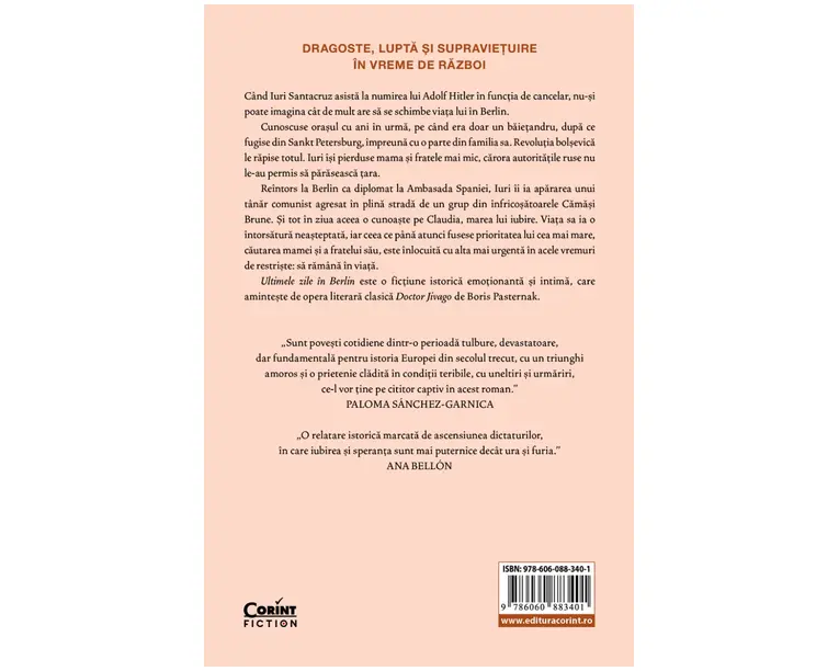Cand Iuri Santacruz asista la numirea lui Adolf Hitler in functia de cancelar, nu-si poate imagina cat de mult are sa se schimbe viata lui in Berlin. Cunoscuse orasul cu ani in urma, pe cand era doar un baietandru, dupa ce fugise din Sankt Petersburg, impreuna cu o parte din familia sa. Revolutia bolsevica le rapise totul. Iuri isi pierduse mama si fratele mai mic, carora autoritatile ruse nu le-au permis sa paraseasca tara. Reintors la Berlin ca diplomat la Ambasada Spaniei, Iuri ii ia apararea unui tanar comunist agresat in plina strada de un grup din infricosatoarele Camasi Brune. Si tot in ziua aceea o cunoaste pe Claudia, marea lui iubire. Viata lui ia o intorsatura neasteptata, iar ceea ce pana atunci fusese prioritatea lui cea mai mare, cautarea mamei si a fratelui sau, este inlocuita cu alta mai urgenta in acele vremuri de restriste: sa ramana in viata. Ultimele zile in Berlin este o fictiune istorica emotionanta si intima care aminteste de opera literara clasica Doctor Jivago de Boris Pasternak. „Sunt povesti cotidiene dintr-o perioada tulbure, devastatoare, dar fundamentala pentru istoria Europei din secolul trecut, cu un triunghi amoros, o prietenie cladita in conditii teribile, cu uneltiri si urmariri, ce-l vor tine pe cititor captiv in acest roman.” Paloma Sánchez-Garnica „O relatare istorica marcata de ascensiunea dictaturilor, in care iubirea si speranta sunt mai puternice decat ura si furia.” Ana Bellón „Paloma Sánchez-Garnica te atrage intr-o fictiune istorica a carei actiune se desfasoara in Europa tulburata si zguduita din temelii de Al Doilea Razboi Mondial. Romanul isi propune sa evidentieze importanta de a-ti trai viata asa cum ti-o doresti, invatand din greselile trecutului, ca sa nu le mai repeti. O calatorie in timp ce ofera un sambure de speranta pentru a depasi orice obstacol si a lupta pentru libertate.” Ana Bellón Produsul cu denumirea Ultimele zile in Berlin face parte din brandul Corint, se afla in categoria Carti de sanatate si subcategoria