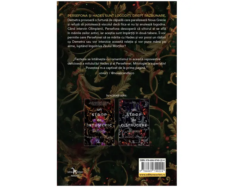 Persefona si Hades sunt logoditi. Drept razbunare, Demetra provoaca o furtuna de zapada care paralizeaza Noua Grecie si refuza sa potoleasca viscolul daca fiica ei nu isi anuleaza logodna. Cand intervin Olimpienii, Persefona descopera ca viitorul ei se afla in mainile zeilor antici, iar acestia sunt impartiti in doua tabere. Ii vor permite oare Persefonei sa se marite cu Hades si vor porni un razboi cu Demetra sau vor interzice aceasta relatie si vor pune mana pe arme, luptand impotriva Zeului Mortilor? „Fantezia se intalneste cu romantismul in aceasta repovestire delicioasa a mitului lui Hades si al Persefonei. Mitologie la superlativ! Povestea m-a captivat de la prima pagina.” Ashley / @novelcandleco „Un vartej emotional de la inceput pana la sfarsit! Mi-a placut sa-i vad pe Hades si pe Sefi crescand atat individual, cat si ca pereche! Abia astept urmatorul volum!” Jess Schmit / @thebarnaclebookshelf „O continuare fierbinte si cu o miza uriasa a seriei care ii are ca protagonisti pe Hades si Persefona. O calatorie captivanta de descoperire a sinelui prin iubire si pierdere, si care presupune sa invatam cum sa ne luam la tranta chiar si cu cele mai intunecate temeri care ne macina.” Alison / @antagonistviews „Saga Hades X Persefona continua in acest volum cu o descriere frumoasa a luptei, a acceptarii de sine si a evolutiei in plan sentimental care trece linia fina dintre realitate si fantezie.” Diamond / @the.polished.diamond Produsul cu denumirea Un strop de cruzime (vol.3 din seria Hades X Persefona) face parte din brandul Corint, se afla in categoria Carti de sanatate si subcategoria