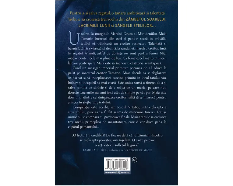 Când un mesager imperial primeste porunca de a-l aduce la palat pe maestrul croitor Tamarin, Maia decide sa se deghizeze în barbat si sa îndeplineasca sarcina primita în locul tatalui sau, bolnav si incapabil sa mai coasa. Este unica sansa a tinerei de a-si salva familia de saracie si de a scapa de un mariaj pe care nu-l doreste. Lucrurile nu sunt însa atât de simple pe cât par: Maia este doar unul dintre cei doisprezece croitori siliti sa se întreaca pentru a intra în slujba împaratului. Competitia este acerba, iar Lordul Vrajitor, mâna dreapta a suveranului, pare sa îsi fi dat seama de minciuna tinerei. Totusi, nimic nu se compara cu provocarea finala: Maia trebuie sa croiasca trei rochii primejdios de încântatoare, care o vor duce pâna la capatul pamântului… „O lectura incredibila! De fiecare data când banuiam încotro se îndreapta povestea, ma înselam. O carte pe care o veti citi cu sufletul la gura!” Tamora Pierce, autoarea seriei „Cercul de magie” „Magia unui basm, curajul si impetuozitatea unei exceptionale aventuri si o protagonista care îsi foloseste creativitatea ca pe o arma. Iata elementele care transforma acest roman într-o adevarata nestemata pentru cei care îndragesc povestile fantasy extravagante!” Natasha Ngan, autoarea romanului Girls of Paper and Fire Produsul cu denumirea Urzeala zorilor (primul volum al seriei Sange de stele) face parte din brandul Corint, se afla in categoria Fantasy si subcategoria