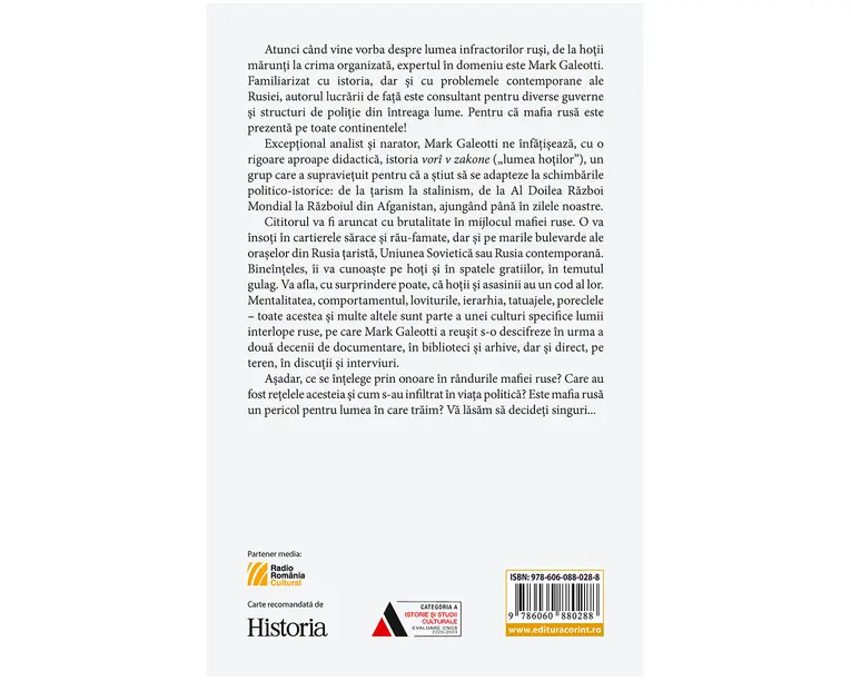 Atunci când vine vorba despre lumea infractorilor rusi, de la hotii marunti la crima organizata, expertul în domeniu este Mark Galeotti. Familiarizat cu istoria, dar si cu problemele contemporane ale Rusiei, autorul lucrarii de fata este consultant pentru diverse guverne si structuri de politie din întreaga lume. Pentru ca mafia rusa este prezenta pe toate continentele! Exceptional analist si narator, Mark Galeotti ne înfatiseaza, cu o rigoare aproape didactica, istoria vorî v zakone („lumea hotilorˮ), un grup care a supravietuit pentru ca a stiut sa se adapteze la schimbarile politico-istorice: de la tarism la stalinism, de la Al Doilea Razboi Mondial la Razboiul din Afganistan, ajungând pâna în zilele noastre. Cititorul va fi aruncat cu brutalitate în mijlocul mafiei ruse. O va însoti în cartierele sarace si rau-famate, dar si pe marile bulevarde ale oraselor din Rusia tarista, Uniunea Sovietica sau Rusia contemporana. Bineînteles, îi va cunoaste pe hoti si în spatele gratiilor, în temutul gulag. Va afla, cu surprindere poate, ca hotii si asasinii au un cod al lor. Mentalitatea, comportamentul, loviturile, ierarhia, tatuajele, poreclele – toate acestea si multe altele sunt parte a unei culturi specifice lumii interlope ruse, pe care Mark Galeotti a reusit s-o descifreze în urma a doua decenii de documentare, în biblioteci si arhive, dar si direct, pe teren, în discutii si interviuri. Asadar, ce se întelege prin onoare în rândurile mafiei ruse? Care au fost retelele acesteia si cum s-au infiltrat în viata politica? Este mafia rusa un pericol pentru lumea în care traim? Va lasam sa decideti singuri... „O fascinanta incursiune în lumea supermafiei rusesti si a legaturilor acesteia cu serviciile secrete ale lui Putin...Aceasta carte nu ar fi putut fi mai relevanta în contextul actual al acuzatiilor globale – si a unei noi serii de sanctiuni americane – împotriva Rusiei.ˮ Matthew Campbell, The Sunday Times „Vorî – însemnând «hotii» – este un ghid deschis si cuprinzator al intersectiei dintre infractionalitate si politica în Rusia.ˮ The Economist „O carte bine documentata, cu o privire aprofundata asupra istoriei crimei organizate din Rusia. Studentii la criminalistica si istorie o vor gasi deopotriva interesanta si calauzitoare.ˮ Paul Davis, The Washington Times „Punctul culminant a peste 25 de ani de scris despre crima organizata din Rusia, Vorî tinde sa devina lucrarea de baza a acestui subiect. Este instructiva si socanta, dar si o placere s-o citesti.ˮ Federico Varese, autorul cartii Mafia Life „Pentru a întelege puterea în Rusia contemporana, este o lectura obligatorie.ˮ Misha Glenny, autorul cartii McMafia „ O prezentare generala extinsa, din punct de vedere istoric, a crimei organizate în Rusia, începând din secolul al XVIII-lea pâna în prezent...o istorie concludenta si accesibila pe care oricine este interesat de crima organizata în general si de Rusia în particular, va dori s-o achizitioneze.ˮ Publishers Weekly Produsul cu denumirea Vori: Hoti si asasini. Supermafia rusa face parte din brandul Corint, se afla in categoria Carti de sanatate si subcategoria