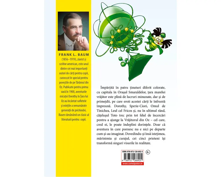 Impartita in patru tinuturi diferit colorate, cu capitala in Orasul Smaraldelor, tara marelui vrajitor este plina de lucruri minunate, dar si de primejdii, pe care eroii acestei carti le infrunta impreuna. Dorothy, Sperie-Ciori, Omul de Tinichea, Leul cel Fricos si, nu in ultimul rand, catelusul Toto trec prin tot felul de incercari pentru a ajunge la Vrajitorul din Oz cel care, cred ei, le poate indeplini dorintele. Doar ca aventura in care pornesc nu e nici pe departe cum si-au imaginat. Dovedindu-si insa istetimea, marinimia si curajul, cei cinci prieteni isi transforma singuri visurile in realitate. „O fabula a sperantei eterne, care ne arata ca lucrurile nu sunt intotdeauna atat de intimidante pe cat par.” The New York Times „Baum a cutezat sa ofere incantare fara instructiuni.” Michael Patrick Hearn „Baum a creat o lume cu adevarat extraordinara, o lume reala… iar apoi a umplut-o cu lucruri uimitoare.” Dinitia Smith Produsul cu denumirea Vrajitorul din Oz face parte din brandul Corint, se afla in categoria Carti de sanatate si subcategoria