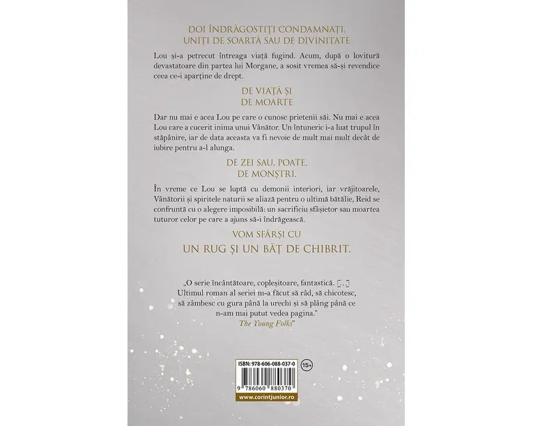 DOI ÎNDRAGOSTITI CONDAMNATI, UNITI DE SOARTA SAU DE DIVINITATE Lou si-a petrecut întreaga viata fugind. Acum, dupa o lovitura devastatoare din partea lui Morgane, a sosit vremea sa-si revendice ceea ce-i apartine de drept. DE VIATA SI DE MOARTE Dar nu mai e acea Lou pe care o cunosc prietenii sai. Nu mai e acea Lou care a cucerit inima unui Vânator. Un întuneric i-a luat trupul în stapânire, iar de data aceasta va fi nevoie de mult mai mult decât de iubire pentru a-l alunga. DE ZEI SAU, POATE, DE MONSTRI. În vreme ce Lou se lupta cu demonii interiori, iar vrajitoarele, Vânatorii si spiritele naturii se aliaza pentru o ultima batalie, Reid se confrunta cu o alegere imposibila: un sacrificiu sfâsietor sau moartea tuturor celor pe care a ajuns sa-i îndrageasca. VOM SFÂRSI CU UN RUG SI UN BAT DE CHIBRIT. „O serie încântatoare, coplesitoare, fantastica. […] Ultimul roman al seriei m-a facut sa râd, sa chicotesc, sa zâmbesc cu gura pâna la urechi si sa plâng pâna ce n-am mai putut vedea pagina.” The Young Folks” „Zei si monstri e un amestec excelent al primelor doua volume. Avem umorul si povestea de dragoste din Sarpe si porumbel, dar si întunericul, emotiile si numeroasele creaturi magice din Sânge si miere. […] Finalul a fost tulburator, iar epilogul, absolut încântator!” Coffee, Book & Candle „Se prea poate ca Zei si monstri sa aiba cele mai bune scene cuReid si Lou din întreaga serie.Speram ca toata lumea saadore sfârsitul, asa cum l-amadorat noi. […] Romanul defata ne-a depasit asteptarile sipoate fi considerat o încheierefantastica a seriei. Cu toateca MEREU ne vom dori sialte aventuri ale celor doiprotagonisti, suntem extremde satisfacuti de felul în careparasim aceasta lume!” Blissfully Bookish „Evenimentele capata o turnura delicios de întunecata în ultimul volum din captivanta serie a lui Shelby Mahurin atunci când Lou se întoarce acasa pentru a-si revendica ceea ce-i apartine – cu orice pret.” WATERSTONES Produsul cu denumirea Zei si monstri (vol.3 din seria Sarpe si porumbel) face parte din brandul Corint, se afla in categoria Carti de sanatate si subcategoria