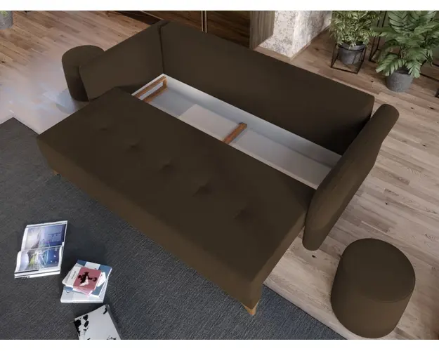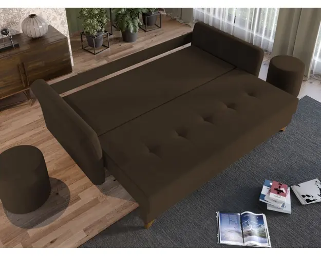 Canapea Bali Maro Canapea Bali Maro are un design modern, contemporan, cu un aspect aparte dat de pernele tip rulou si bratele rotunjite. Picioarele de culoarea lemnului completeaza eleganta acestei canapele. Pe langa aspect, ofera confort prin cele 4 perne detasabile cat si prin faptul ca se poate transforma rapid intr-un pat ce are lada de depozitare dedesubt. Bratele, sezutul si pernele de la spatar au cusaturi ce dau un design armonios in orice camera. Este recomandata atat pentru incaperi mici sau mari si are dimensiunea de: 230 cm lungime, 100 cm latime, 90 cm inaltime totala . Dupa extindere, obtineti un spatiu pentru odihna si relaxare, cu suprafata utila 193 x 145 cm . Este tapitata cu o stofa de calitate uni pe diverse culori. Atentie: Pretul afisat nu include alte accesorii sau obiecte de decor. Taburetele, pernele deco si draperiile se pot achizitiona optional. Livrare gratuita si rapida, 4-10 zile lucratoare prin flota proprie Suntem producatori de tapiterii, fara intermediari Toate piesele de tapiterii au o garantie de 2 ani Sezutul si extensia canapelei sunt pe relaxa (arcuri elicoidale si poliuretan) . Lada incorporata este ideala pentru depozitarea lenjeriei sau a altor obiecte. Scheletul este rezistent, realizat pe structura solida de fag si pal. Extensia este de tip Doppelliege ce prezinta un sistem actionat prin role, astfel ca partea de sezut se trage si permite partii de spatar sa gliseze spre partea din fata si sa se pozitioneze orizontal. Canapea Bali Maro se incadreaza cu usurinta in majoritatea locuintelor indiferent de stilul acestora. Puteti alege din mai multe culori pentru stofa. Produsele disponibile le puteti vedea aici Modele Bali . Dimensiuni Canapea Bali Maro Lungime: 230 cm Latime: 100 cm Lungime intre brate: 193 cm Inaltime sezut: 45 cm Adancime sezut: 78 cm (fara perne) Adancime sezut: 57 cm (pana in perne) Inaltime cu perne: 90 cm Inaltime fara perne: 74 cm Dimensiuni extinsa Lungime extinsa: 193 cm Adancime extinsa: 145 cm Dimensiuni brate Inaltime brate: 70 cm Lungime brate: 100 cm Tapiterie Canapea Bali Maro Tapiteria produsului este din stofa Maro . Nuanta acestui produs nu este pretentioasa, mascheaza eventualele evenimente neplacute prin care se poate murdari sau pata si se integreaza perfect in majoritatea locuintelor. Intretinere: se recomanda ca praful sa se stearga cu un material textil moale (finet) umed si sa nu se curete cu agenti chimici (diluant, acetona). Imaginile sunt cu titlu de prezentare si pot avea mici diferente de nuante in functie de display. Dimensiunile sunt exprimate in centimetri si pot oscila intre ± 50 mm. Produsul cu denumirea Canapea Bali Maro face parte din brandul Mobila laguna, se afla in categoria Centrale pe peleti si subcategoria