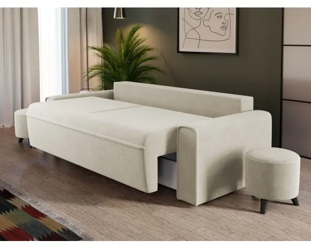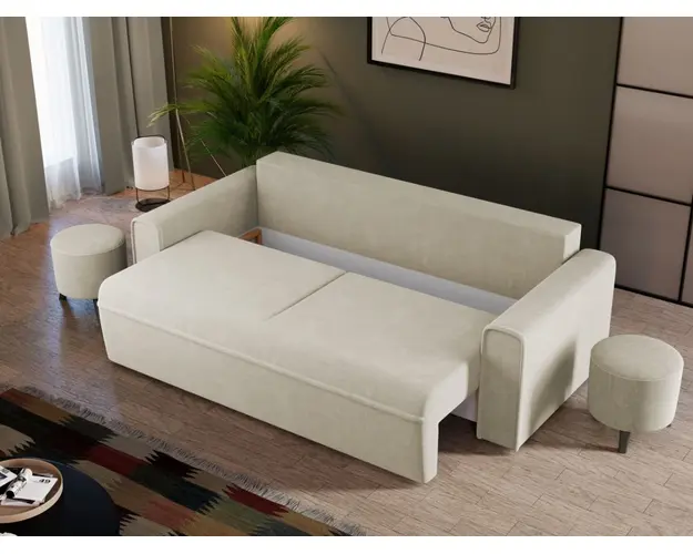 Canapea Blanca Coral 65 Canapea Blanca Coral 65 este o canapea extensibila caracterizata de linii simple si minimaliste , fiind usor de integrat in orice decor. Moderna si totodata eleganta, aceasta este si confortabila datorita celor doua perne mari detasabile si bratelor usor rotunjite. Printre cele mai importante functii ale canapelei este capacitatea de a se transforma intr-un pat confortabil de 190 x 145 cm . Este prevazuta cu lada de depozitare si are dimensiunile de: 230 cm lungime, 100 cm latime, 90 cm inaltime totala . Este tapitata cu o stofa premium uni pe diverse culori. Atentie: Pretul afisat nu include alte accesorii sau obiecte de decor. Taburetele, pernele deco si draperiile se pot achizitiona optional. Livrare gratuita si rapida, 4-10 zile lucratoare prin flota proprie Suntem producatori de tapiterii, fara intermediari Toate piesele de tapiterii au o garantie de 2 ani Sezutul si extensia canapelei sunt pe relaxa (arcuri elicoidale si poliuretan) . Scheletul este rezistent, realizat pe structura solida de fag si pal . Extensia este de tip Lift: partea de sezut se ridica si se trage in fata, permitand partii de spatar sa gliseze spre partea din fata si sa se pozitioneze orizontal. Canapea Blanca Coral 65 se incadreaza cu usurinta in majoritatea locuintelor indiferent de stilul acestora. Puteti alege din mai multe culori pentru stofa. Produsele disponibile le puteti vedea aici Modele Blanca . Dimensiuni Canapea Blanca Lungime: 230 cm Latime: 100 cm Inaltime sezut: 46 cm Inaltime totala: 90 cm Inaltime brate: 60 cm Grosime brate: 20 cm Adancime sezut cu perne: 60 cm Adancime sezut fara perne: 80 cm Inaltime picior: 3 cm Dimensiuni extinsa Lungime extinsa: 190 cm Adancime extinsa: 145 cm Tapiterie Canapea Blanca Coral 65 Tapiteria produsului este din stofa Crem - Coral 65 . Nuanta acestui produs nu este pretentioasa, mascheaza eventualele evenimente neplacute prin care se poate murdari sau pata si se integreaza perfect in majoritatea locuintelor. Intretinere: se recomanda ca praful sa se stearga cu un material textil moale (finet) umed si sa nu se curete cu agenti chimici (diluant, acetona). Imaginile sunt cu titlu de prezentare si pot avea mici diferente de nuante in functie de display. Dimensiunile sunt exprimate in centimetri si pot oscila intre ± 50 mm. Produsul cu denumirea Canapea Blanca Coral 65 face parte din brandul Mobila laguna, se afla in categoria Centrale mixte lemn si peleti si subcategoria