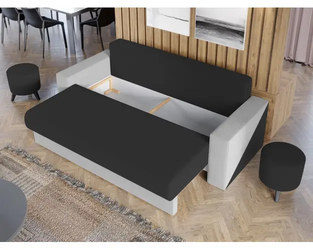 Canapea Bravisimo Gri Antracit / Gri Deschis Canapea Bravisimo Gri Antracit / Gri Deschis este o canapea versatila, cu un design inedit, care iese in evidenta in orice sufragerie sau living. Datorita posibilitatii de extindere , obtineti un spatiu pentru odihna si relaxare cu suprafata utila de 148 x 190 cm . Aceasta este prevazuta si cu lada de depozitare , utila pentru a pastra lenjeria, pernele sau patura si pentru a pastra la indemana toate articolele frecvent utilizate. Este o canapea cu trei locuri , dimensiunile acesteia fiind de: 235 cm lungime, 100 cm latime, 90 cm inaltime totala. Este tapitata cu stofa de calitate pe diverse culori. Dungile pernelor sunt din stofa de aceeasi culoare ca si restul canapelei. Atentie: Pretul afisat nu include alte accesorii sau obiecte de decor. Taburetele, pernele deco si draperiile se pot achizitiona optional. Livrare gratuita si rapida, 4-10 zile lucratoare prin flota proprie Suntem producatori de tapiterii, fara intermediari Toate piesele de tapiterii au o garantie de 2 ani Sezutul si extensia canapelei sunt pe relaxa (arcuri elicoidale si poliuretan) . Scheletul este rezistent, realizat pe structura solida de fag si pal . Extensia este de tip Doppelliege, ce prezinta un sistem actionat prin role, astfel ca partea de sezut se trage si permite partii de spatar sa gliseze spre partea din fata si sa se pozitioneze orizontal. Canapea Bravisimo Gri Antracit / Gri Deschis se incadreaza cu usurinta in majoritatea locuintelor indiferent de stilul acestora. Puteti alege din mai multe culori pentru stofa. Produsele disponibile le puteti vedea aici Modele Bravisimo . Dimensiuni Canapea Bravisimo Gri Antracit / Gri Deschis Lungime: 235 cm Latime: 100 cm Lungime intre brate: 190 cm Inaltime sezut: 45 cm Inaltime: 90 cm Adancime sezut: 75 cm Inaltime brate: 60 cm Lungime brate: 92 cm Grosime brate: 21 cm Dimensiuni extinsa Lungime extinsa: 190 cm Adancime extinsa: 148 cm Tapiterie Canapea Bravisimo Gri Antracit / Gri Deschis Tapiteria produsului este din stofa Gri Antracit si Gri Deschis . Nuantele acestui produs nu sunt pretentioase, mascheaza eventualele evenimente neplacute prin care se pot murdari sau pata si se integreaza perfect in majoritatea locuintelor. Intretinere: se recomanda ca praful sa se stearga cu un material textil moale (finet) umed si sa nu se curete cu agenti chimici (diluant, acetona). Imaginile sunt cu titlu de prezentare si pot avea mici diferente de nuante in functie de display. Dimensiunile sunt exprimate in centimetri si pot oscila intre ± 50 mm. Produsul cu denumirea Canapea Bravisimo Gri Antracit / Gri Deschis face parte din brandul Mobila laguna, se afla in categoria Centrale mixte lemn si peleti si subcategoria