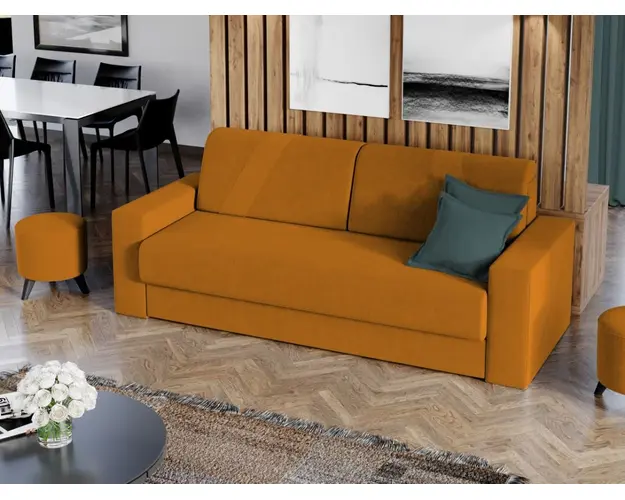 Canapea Bravisimo Portocalie Canapea Bravisimo Portocalie este o canapea versatila, cu un design inedit, care iese in evidenta in orice sufragerie sau living. Datorita posibilitatii de extindere , obtineti un spatiu pentru odihna si relaxare cu suprafata utila de 148 x 190 cm . Aceasta este prevazuta si cu lada de depozitare , utila pentru a pastra lenjeria, pernele sau patura si pentru a pastra la indemana toate articolele frecvent utilizate. Este o canapea cu trei locuri , dimensiunile acesteia fiind de: 235 cm lungime, 100 cm latime, 90 cm inaltime totala. Este tapitata cu stofa de calitate pe diverse culori. Dungile pernelor sunt din stofa de aceeasi culoare ca si restul canapelei. Atentie: Pretul afisat nu include alte accesorii sau obiecte de decor. Taburetele, pernele deco si draperiile se pot achizitiona optional. Livrare gratuita si rapida, 4-10 zile lucratoare prin flota proprie Suntem producatori de tapiterii, fara intermediari Toate piesele de tapiterii au o garantie de 2 ani Sezutul si extensia canapelei sunt pe relaxa (arcuri elicoidale si poliuretan) . Scheletul este rezistent, realizat pe structura solida de fag si pal . Extensia este de tip Doppelliege, ce prezinta un sistem actionat prin role, astfel ca partea de sezut se trage si permite partii de spatar sa gliseze spre partea din fata si sa se pozitioneze orizontal. Canapea Bravisimo Portocalie se incadreaza cu usurinta in majoritatea locuintelor indiferent de stilul acestora. Puteti alege din mai multe culori pentru stofa. Produsele disponibile le puteti vedea aici Modele Bravisimo . Dimensiuni Canapea Bravisimo Portocalie Lungime: 235 cm Latime: 100 cm Lungime intre brate: 190 cm Inaltime sezut: 45 cm Inaltime: 90 cm Adancime sezut: 75 cm Inaltime brate: 60 cm Lungime brate: 92 cm Grosime brate: 21 cm Dimensiuni extinsa Lungime extinsa: 190 cm Adancime extinsa: 148 cm Tapiterie Canapea Bravisimo Portocalie Tapiteria produsului este din stofa Portocalie . Nuanta acestui produs nu este pretentioasa, mascheaza eventualele evenimente neplacute prin care se poate murdari sau pata si se integreaza perfect in majoritatea locuintelor. Intretinere: se recomanda ca praful sa se stearga cu un material textil moale (finet) umed si sa nu se curete cu agenti chimici (diluant, acetona). Imaginile sunt cu titlu de prezentare si pot avea mici diferente de nuante in functie de display. Dimensiunile sunt exprimate in centimetri si pot oscila intre ± 50 mm. Produsul cu denumirea Canapea Bravisimo Portocalie face parte din brandul Mobila laguna, se afla in categoria Centrale mixte lemn si peleti si subcategoria