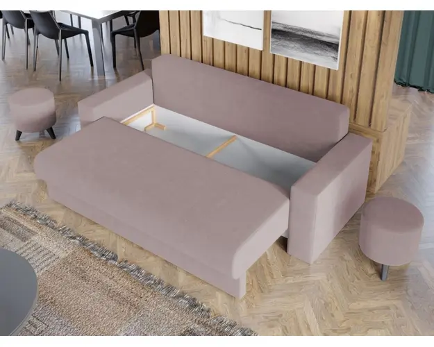 Canapea Bravisimo Roze Canapea Bravisimo Roze este o canapea versatila, cu un design inedit, care iese in evidenta in orice sufragerie sau living. Datorita posibilitatii de extindere , obtineti un spatiu pentru odihna si relaxare cu suprafata utila de 148 x 190 cm . Aceasta este prevazuta si cu lada de depozitare , utila pentru a pastra lenjeria, pernele sau patura si pentru a pastra la indemana toate articolele frecvent utilizate. Este o canapea cu trei locuri , dimensiunile acesteia fiind de: 235 cm lungime, 100 cm latime, 90 cm inaltime totala. Este tapitata cu stofa de calitate pe diverse culori. Dungile pernelor sunt din stofa de aceeasi culoare ca si restul canapelei. Atentie: Pretul afisat nu include alte accesorii sau obiecte de decor. Taburetele, pernele deco si draperiile se pot achizitiona optional. Livrare gratuita si rapida, 4-10 zile lucratoare prin flota proprie Suntem producatori de tapiterii, fara intermediari Toate piesele de tapiterii au o garantie de 2 ani Sezutul si extensia canapelei sunt pe relaxa (arcuri elicoidale si poliuretan) . Scheletul este rezistent, realizat pe structura solida de fag si pal . Extensia este de tip Doppelliege, ce prezinta un sistem actionat prin role, astfel ca partea de sezut se trage si permite partii de spatar sa gliseze spre partea din fata si sa se pozitioneze orizontal. Canapea Bravisimo Roze se incadreaza cu usurinta in majoritatea locuintelor indiferent de stilul acestora. Puteti alege din mai multe culori pentru stofa. Produsele disponibile le puteti vedea aici Modele Bravisimo . Dimensiuni Canapea Bravisimo Roze Lungime: 235 cm Latime: 100 cm Lungime intre brate: 190 cm Inaltime sezut: 45 cm Inaltime: 90 cm Adancime sezut: 75 cm Inaltime brate: 60 cm Lungime brate: 92 cm Grosime brate: 21 cm Dimensiuni extinsa Lungime extinsa: 190 cm Adancime extinsa: 148 cm Tapiterie Canapea Bravisimo Roze Tapiteria produsului este din stofa Roze . Nuanta acestui produs nu este pretentioasa, mascheaza eventualele evenimente neplacute prin care se poate murdari sau pata si se integreaza perfect in majoritatea locuintelor. Intretinere: se recomanda ca praful sa se stearga cu un material textil moale (finet) umed si sa nu se curete cu agenti chimici (diluant, acetona). Imaginile sunt cu titlu de prezentare si pot avea mici diferente de nuante in functie de display. Dimensiunile sunt exprimate in centimetri si pot oscila intre ± 50 mm. Produsul cu denumirea Canapea Bravisimo Roze face parte din brandul Mobila laguna, se afla in categoria Centrale mixte lemn si peleti si subcategoria
