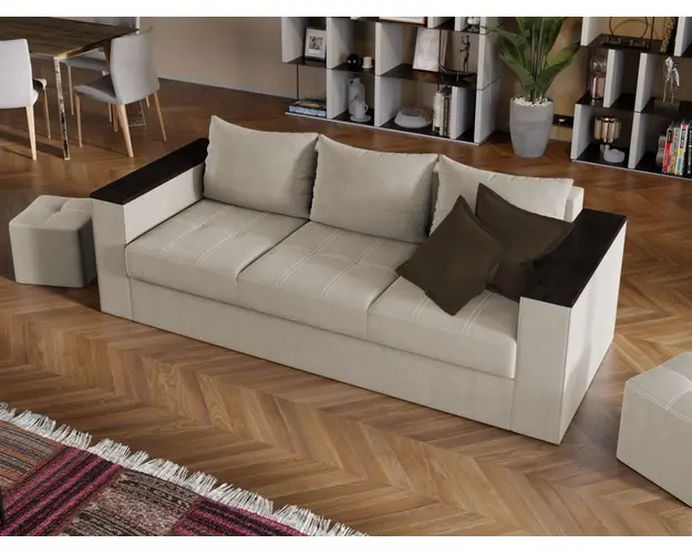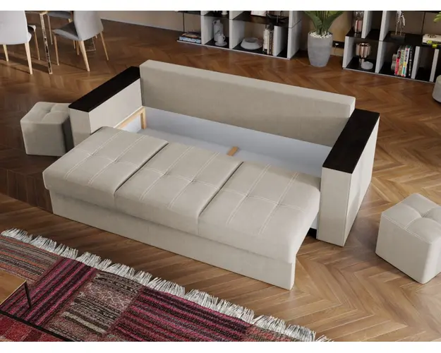 Canapea Dante L Crem Canapea Dante L Crem este o canapea cu stil care se remarca prin bratele cu insertii de lemn si prin cusaturile contrastante de pe sezut. Aceasta imbina stilul cu functionalitatea prin faptul ca este prevazuta cu lada ideala pentru depozitarea lenjeriei, a pernelor sau a paturii si pentru a pastra la indemana toate articolele frecvent utilizate. Canapeaua ofera confort prin cele 3 perne detasabile si se poate transforma intr-un pat cu suprafata utila de 190 x 150 cm in doar cateva minute.Acesta are dimensiunea de: 235 cm lungime, 96 cm latime, 77 cm inaltime totala . Este tapitata cu stofa de calitate pe diverse culori. Atentie: Pretul afisat nu include alte accesorii sau obiecte de decor. Taburetele, pernele deco si draperiile se pot achizitiona optional. Livrare gratuita si rapida, 4-10 zile lucratoare prin flota proprie Suntem producatori de tapiterii, fara intermediari Toate piesele de tapiterii au o garantie de 2 ani Sezutul si extensia canapelei sunt pe relaxa (arcuri elicoidale si poliuretan) . Scheletul este rezistent, realizat pe structura solida de fag si pal . Extensia este de tip Doppelliege, ce prezinta un sistem actionat prin role, astfel ca partea de sezut se trage si permite partii de spatar sa gliseze spre partea din fata si sa se pozitioneze orizontal. Canapea Dante L Crem se incadreaza cu usurinta in majoritatea locuintelor indiferent de stilul acestora. Puteti alege din mai multe culori pentru stofa. Produsele disponibile le puteti vedea aici Modele Dante L . Dimensiuni Canapea Dante L Crem Lungime: 235 cm Latime: 96 cm Lungime intre brate: 190 cm Inaltime sezut: 45 cm Inaltime: 77 cm Adancime sezut: 76 cm Dimensiuni extinsa Lungime extinsa: 190 cm Adancime extinsa: 150 cm Dimensiuni brate Lungime brate: 91 cm Inaltime brate: 61 cm Grosime brate: 20 cm Tapiterie Canapea Dante L Crem Tapiteria produsului este din stofa Crem . Nuanta acestui produs nu este pretentioasa, mascheaza eventualele evenimente neplacute prin care se poate murdari sau pata si se integreaza perfect in majoritatea locuintelor. Intretinere: se recomanda ca praful sa se stearga cu un material textil moale (finet) umed si sa nu se curete cu agenti chimici (diluant, acetona). Imaginile sunt cu titlu de prezentare si pot avea mici diferente de nuante in functie de display. Dimensiunile sunt exprimate in centimetri si pot oscila intre ± 50 mm. Produsul cu denumirea Canapea Dante L Crem face parte din brandul Mobila laguna, se afla in categoria Centrale mixte lemn si peleti si subcategoria
