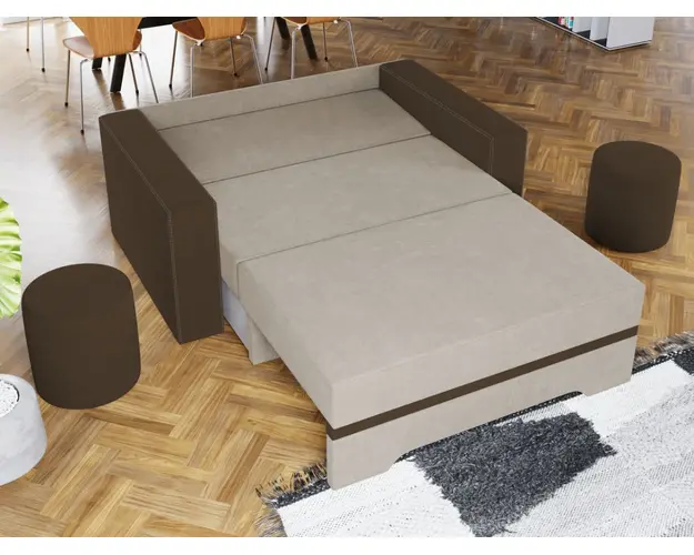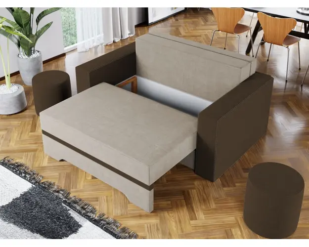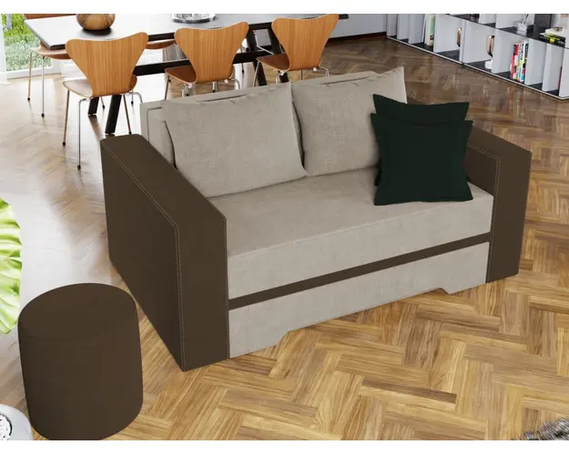 Canapea Ema Crem / Maro Recomandata pentru cei ce isi doresc un somn odihnitor intr-un spatiu redus ca dimensiuni, Canapea Ema Crem / Maro ofera tot ce ai nevoie: extindere transversala si lada pentru depozitare . Cele doua perne detasabile aduc acesteia un plus si in confort, sustinand corpul in pozitia dorita. Este potrivita pentru incaperi mici, avand dimensiunile de: 164 cm lungime, 103 cm latime, 80 cm inaltime totala . In plus, datorita posibilitatii de extindere , se obtine un spatiu pentru odihna cu suprafata de 190 x 130 cm .Este tapitata cu stofa de calitate pe diverse culori. Atentie: Pretul afisat nu include alte accesorii sau obiecte de decor. Taburetele, pernele deco si draperiile se pot achizitiona optional. Livrare gratuita si rapida, 4-10 zile lucratoare prin flota proprie Suntem producatori de tapiterii, fara intermediari Toate piesele de tapiterii au o garantie de 2 ani Sezutul si extensia canapelei sunt pe arcuri elicoidale si poliuretan. Scheletul este rezistent, realizat pe structura solida de fag si pal . Extensia este de tip Doppelliege, ce prezinta un sistem actionat prin role, astfel ca partea de sezut se trage si permite partii de spatar sa gliseze spre partea din fata si sa se pozitioneze orizontal. Canapea Ema Crem / Maro se incadreaza cu usurinta in majoritatea locuintelor indiferent de stilul acestora. Puteti alege din mai multe culori pentru stofa. Produsele disponibile le puteti vedea aici Modele Ema . Dimensiuni Canapea Ema Crem / Maro Lungime: 164 cm Latime: 103 cm Lungime intre brate: 130 cm Inaltime sezut: 39 cm Inaltime: 80 cm Adancime sezut: 70 cm Inaltime brate: 59 cm Lungime brate: 100 cm Grosime brate: 17 cm Dimensiuni extinsa Lungime extinsa: 130 cm Adancime extinsa: 190 cm Tapiterie Canapea Ema Crem / Maro Tapiteria produsului este din stofa Crem si Maro . Nuantele acestui produs nu sunt pretentioase, mascheaza eventualele evenimente neplacute prin care se pot murdari sau pata si se integreaza perfect in majoritatea locuintelor. Intretinere: se recomanda ca praful sa se stearga cu un material textil moale (finet) umed si sa nu se curete cu agenti chimici (diluant, acetona). Imaginile sunt cu titlu de prezentare si pot avea mici diferente de nuante in functie de display. Dimensiunile sunt exprimate in centimetri si pot oscila intre ± 50 mm. Produsul cu denumirea Canapea Ema Crem / Maro face parte din brandul Mobila laguna, se afla in categoria Centrale mixte lemn si peleti si subcategoria