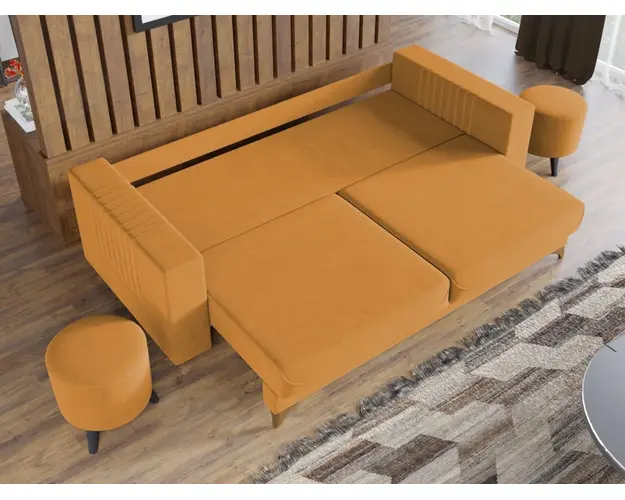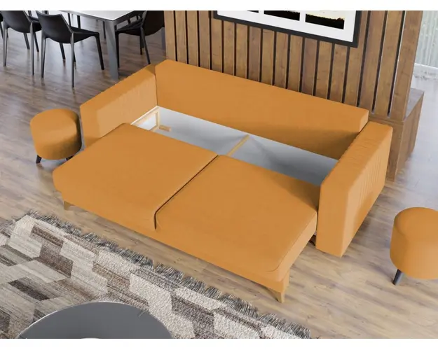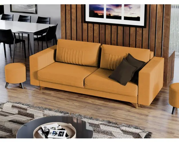 Canapea Granity Whisper 9 Canapea Granity Whisper 9 este o canapea moderna si confortabila care iese in evidenta prin cutele de pe brate si perne. Picioarele de culoarea lemnului completeaza eleganta acestei canapele. Pe langa aspect, ofera confort prin cele 2 perne detasabile , cat si prin faptul ca se poate transforma rapid intr-un pat ce are lada de depozitare dedesubt. Este destinata atat incaperilor mici, cat si celor mai spatioase, avand dimensiunea de: 233 cm lungime, 96 cm latime, 75 cm inaltime totala . Dupa extindere, obtineti un spatiu pentru odihna si relaxare, cu suprafata utila 190 x 150 cm . Este tapitata cu o stofa de calitate uni pe diverse culori. Atentie: Pretul afisat nu include alte accesorii sau obiecte de decor. Taburetele, pernele deco si draperiile se pot achizitiona optional. Livrare gratuita si rapida, 4-10 zile lucratoare prin flota proprie Suntem producatori de tapiterii, fara intermediari Toate piesele de tapiterii au o garantie de 2 ani Sezutul si extensia canapelei sunt pe relaxa (arcuri elicoidale si poliuretan) . Scheletul este rezistent, realizat pe structura solida de fag si pal. Extensia este de tip Doppelliege, ce prezinta un sistem actionat prin role, astfel ca partea de sezut se trage si permite partii de spatar sa gliseze spre partea din fata si sa se pozitioneze orizontal. Canapea Granity Whisper 9 se incadreaza cu usurinta in majoritatea locuintelor indiferent de stilul acestora. Puteti alege din mai multe culori pentru stofa. Produsele disponibile le puteti vedea aici Modele Granity . Videoclipul contine alta nuanta decat cea de pe pagina produsului, acesta avand ca scop prezentarea familiei pentru a se reda in detaliu aspectul materialului. Dimensiuni Canapea Granity Whisper 9 Lungime: 233 cm Latime: 96 cm Lungime intre brate: 190 cm Inaltime sezut: 44 cm Inaltime: 85 cm Inaltime fara perne: 76 cm Inaltime picior: 10 cm Adancime sezut cu perne: 57 cm Adancime sezut fara perne: 85 cm Dimensiuni extinsa Lungime extinsa: 190 cm Adancime extinsa: 150 cm Dimensiuni brate Inaltime brate: 66 cm Inaltime brate fara picioare: 56 cm Lungime brate: 96 cm Grosime brate: 20 cm Tapiterie Canapea Granity Whisper 9 Tapiteria produsului este din stofa Galbena - Whisper 9 . Nuanta acestui produs nu este pretentioasa, mascheaza eventualele evenimente neplacute prin care se poate murdari sau pata si se integreaza perfect in majoritatea locuintelor. Intretinere: se recomanda ca praful sa se stearga cu un material textil moale (finet) umed si sa nu se curete cu agenti chimici (diluant, acetona). Imaginile sunt cu titlu de prezentare si pot avea mici diferente de nuante in functie de display. Dimensiunile sunt exprimate in centimetri si pot oscila intre ± 50 mm. Produsul cu denumirea Canapea Granity Whisper 9 face parte din brandul Mobila laguna, se afla in categoria Centrale mixte lemn si peleti si subcategoria