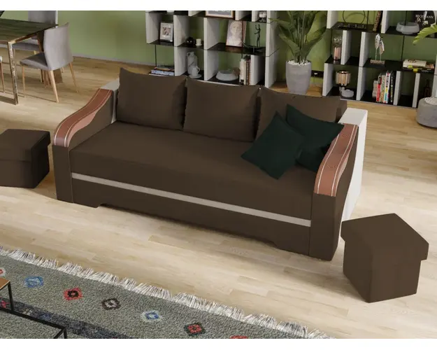 Canapea Julia Maro / Crem Canapea Julia Maro / Crem este o canapea clasica si solida. Ornamentele aplicate ale bratelor completeaza forma eleganta a unui mobilier incapator. Imbina stilul cu functionalitatea prin faptul ca este prevazuta cu lada pentru depozitare a lenjeriei, a pernelor sau a paturii si pentru a pastra la indemana toate articolele frecvent utilizate. Canapeaua ofera un confort sporit prin cele 3 perne detasabile si se transforma rapid si usor intr-un pat spatios de 190 x 150 cm atunci cand scoti pernele si tragi sezutul in exterior coborand spatarul. Aceasta are dimensiunea de: 230 cm lungime, 106 cm latime, 80 cm inaltime totala . Este tapitata cu stofa de calitate pe diverse culori. Atentie: Pretul afisat nu include alte accesorii sau obiecte de decor. Taburetele, pernele deco si draperiile se pot achizitiona optional. Livrare gratuita si rapida, 4-10 zile lucratoare prin flota proprie Suntem producatori de tapiterii, fara intermediari Toate piesele de tapiterii au o garantie de 2 ani Sezutul si extensia canapelei sunt pe relaxa (arcuri elicoidale si poliuretan) . Scheletul este rezistent, realizat pe structura solida de fag si pal . Extensia este de tip Doppelliege, ce prezinta un sistem actionat prin role, astfel ca partea de sezut se trage si permite partii de spatar sa gliseze spre partea din fata si sa se pozitioneze orizontal. Canapea Julia Maro / Crem se incadreaza cu usurinta in majoritatea locuintelor indiferent de stilul acestora. Puteti alege din mai multe culori pentru stofa. Produsele disponibile le puteti vedea aici Modele Julia . Dimensiuni Canapea Julia Lungime: 230 cm Latime: 106 cm Lungime intre brate: 190 cm Inaltime sezut: 45 cm Inaltime: 80 cm Adancime sezut: 80 cm Dimensiuni extinsa Lungime extinsa: 190 cm Adancime extinsa: 150 cm Tapiterie Canapea Julia Maro / Crem Tapiteria produsului este din stofa Maro si Crem . Nuantele acestui produs nu sunt pretentioase, mascheaza eventualele evenimente neplacute prin care se pot murdari sau pata si se integreaza perfect in majoritatea locuintelor. Intretinere: se recomanda ca praful sa se stearga cu un material textil moale (finet) umed si sa nu se curete cu agenti chimici (diluant, acetona). Imaginile sunt cu titlu de prezentare si pot avea mici diferente de nuante in functie de display. Dimensiunile sunt exprimate in centimetri si pot oscila intre ± 50 mm. Produsul cu denumirea Canapea Julia Maro / Crem face parte din brandul Mobila laguna, se afla in categoria Centrale mixte lemn si peleti si subcategoria