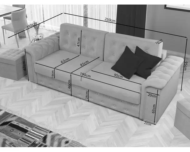 Canapea Olimp Aphrodite 3 Canapea Olimp Aphrodite 3 combina stilul si confortul, fiind alegerea potrivita pentru locuinta dumneavoastra. Nota eleganta este data de butonii decorativi prezenti pe brate, pe fata sezutului, pe cele doua perne detasabile, cat si de picioarele cu finisaj argintiu . Pe langa aspectul aparte, aceasta este prevazuta cu lada ideala pentru depozitarea lenjeriei, a pernelor sau a paturii si pentru a pastra la indemana toate articolele frecvent utilizate. Printre cele mai importante functii ale canapelei este capacitatea de a se transforma intr-un pat confortabil de 190 x 150 cm . Este recomandata atat pentru incaperi medii sau mari si are dimensiunea de: 250 cm lungime, 105 cm latime, 95 cm inaltime totala . Este tapitata cu o stofa premium uni pe diverse culori. Atentie: Pretul afisat nu include alte accesorii sau obiecte de decor. Taburetele, pernele deco si draperiile se pot achizitiona optional. Livrare gratuita si rapida, 4-10 zile lucratoare prin flota proprie Suntem producatori de tapiterii, fara intermediari Toate piesele de tapiterii au o garantie de 2 ani Sezutul si extensia canapelei sunt pe relaxa (arcuri elicoidale si poliuretan) . Scheletul este rezistent, realizat pe structura solida de fag si pal . Extensia este de tip Doppelliege, ce prezinta un sistem actionat prin role, astfel ca partea de sezut se trage si permite partii de spatar sa gliseze spre partea din fata si sa se pozitioneze orizontal. Canapea Olimp Aphrodite 3 se incadreaza cu usurinta in majoritatea locuintelor indiferent de stilul acestora. Puteti alege din mai multe culori pentru stofa. Produsele disponibile le puteti vedea aici Modele Olimp . Videoclipul contine alta nuanta decat cea de pe pagina produsului, acesta avand ca scop prezentarea familiei pentru a se reda in detaliu aspectul materialului. Dimensiuni Canapea Olimp Aphrodite 3 Lungime: 250 cm Latime: 105 cm Inaltime sezut: 46 cm Inaltime totala: 95 cm Inaltime fara perne: 72 cm Adancime sezut cu perne: 62 cm Adancime sezut fara perne: 85 cm Inaltime brate: 67 cm Lungime picior: 22 cm Inaltime picior: 4 cm Dimensiuni extinsa Lungime extinsa: 190 cm Adancime extinsa: 150 cm Tapiterie Canapea Olimp Aphrodite 3 Tapiteria produsului este din stofa Aphrodite 3 . Nuanta acestui produs nu este pretentioasa, mascheaza eventualele evenimente neplacute prin care se poate murdari sau pata si se integreaza perfect in majoritatea locuintelor. Intretinere: se recomanda ca praful sa se stearga cu un material textil moale (finet) umed si sa nu se curete cu agenti chimici (diluant, acetona). Imaginile sunt cu titlu de prezentare si pot avea mici diferente de nuante in functie de display. Dimensiunile sunt exprimate in centimetri si pot oscila intre ± 50 mm. Produsul cu denumirea Canapea Olimp Aphrodite 3 face parte din brandul Mobila laguna, se afla in categoria Centrale mixte lemn si peleti si subcategoria