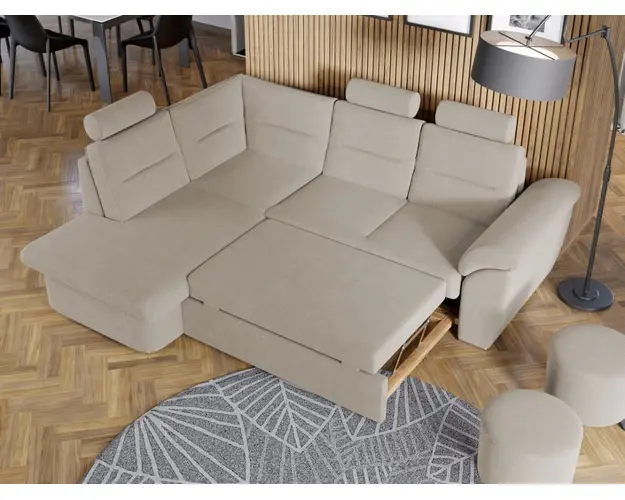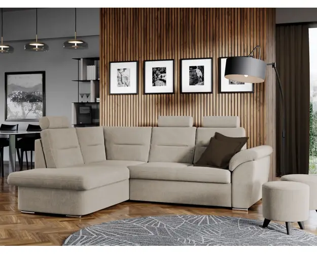 Coltar Biano Crem Coltar Biano Crem are un design modern , contemporan si un aspect impunator, caracterizat de forme rotunjite si simple. Imbina cu succes functionalitatea cu designul, transformandu-se rapid intr-un pat confortabil de 182 x 127 cm . Este prevazut cu lada pentru depozitare pozitionata sub sezlong, care poate fi accesata prin ridicarea partii superioare a acestuia. Poti avea parte de relaxare completa si un confort sporit, gratie tetierelor reglabile , spatarului si bratului care ofera sustinere corpului tau exact in pozitia dorita. Este potrivit pentru un living cu dimensiuni generoase, avand dimensiunea de: 245 cm lungime, 184 cm latime, 106 cm inaltime totala . Este tapitat cu stofa de calitate pe diverse culori. Atentie: Pretul afisat nu include alte accesorii sau obiecte de decor. Taburetele, pernele deco si draperiile se pot achizitiona optional. Livrare gratuita si rapida, 4-10 zile lucratoare prin flota proprie Suntem producatori de tapiterii, fara intermediari Toate piesele de tapiterii au o garantie de 2 ani Sezutul si extensia coltarului sunt din poliuretan High Resilience . Scheletul este rezistent, realizat pe structura solida de fag si pal. Extensia de tip sertar este pozitionata sub sezutul coltarului. Se deschide ca un sertar, apoi se ridica salteaua din interiorul acestuia. Coltar Biano Crem se incadreaza cu usurinta in majoritatea locuintelor indiferent de stilul acestora. Puteti alege din mai multe culori pentru stofa. Produsele disponibile le puteti vedea aici Modele Biano . Dimensiuni Coltar Biano Lungime: 245 cm Latime: 184 cm Lungime intre brate: 182 cm Inaltime sezut: 43 cm Inaltime : 106 cm Adancime sezut: 60 cm Adancime selon 152 cm Latime sezlon 98 cm Dimensiuni extinsa Lungime extinsa: 182 cm Adancime extinsa: 127 cm Tapiterie Coltar Biano Crem Tapiteria produsului este din stofa Crem. Nuanta acestui produs nu este pretentioasa, mascheaza eventualele evenimente neplacute prin care se poate murdari sau pata si se integreaza perfect in majoritatea locuintelor. Intretinere: se recomanda ca praful sa se stearga cu un material textil moale (finet) umed si sa nu se curete cu agenti chimici (diluant, acetona). Imaginile sunt cu titlu de prezentare si pot avea mici diferente de nuante in functie de display. Dimensiunile sunt exprimate in centimetri si pot oscila intre ± 50 mm. Produsul cu denumirea Coltar Biano Crem face parte din brandul Mobila laguna, se afla in categoria Canapele extensibile si subcategoria