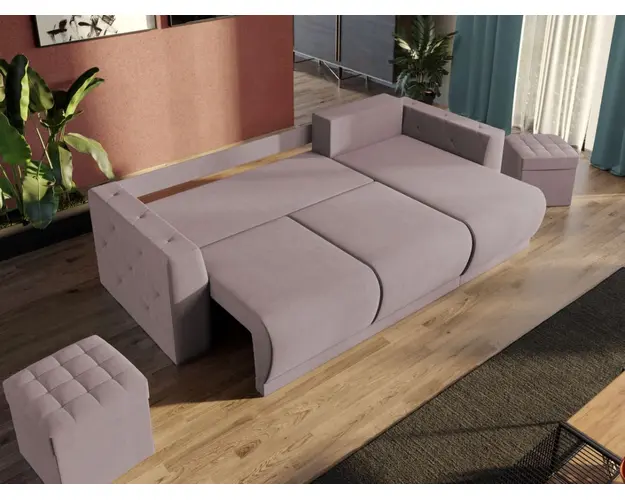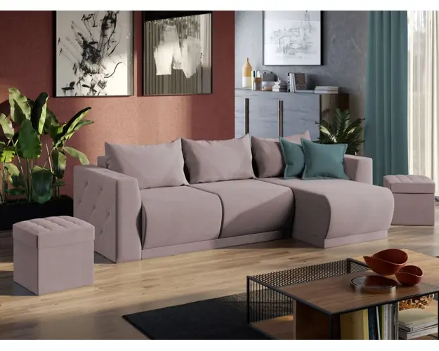 Coltar Luna Roze Oferind trei locuri primitoare, Coltar Luna Roze este un mobilier potrivit incaperilor mici sau medii si cochete. Mai mult, aspectul dat de liniile curbate ale sezutului, bratelor si celor 3 perne detasabile il face potrivit oricarei case moderne si confera sustinere corpului exact in pozitia dorita. Butonii de pe brate dau un plus de eleganta si stil oricarui living. Coltarul se transforma usor intr-un pat spatios de 220×155 cm si este prevazut cu lada pentru depozitare . Acesta are dimensiunea de: 266 cm lungime, 155 cm latime, 87 cm inaltime totala . Este tapitat cu stofa de calitate pe diverse culori. Atentie: Pretul afisat nu include alte accesorii sau obiecte de decor. Taburetele, pernele deco si draperiile se pot achizitiona optional. Livrare gratuita si rapida, 4-10 zile lucratoare prin flota proprie Suntem producatori de tapiterii, fara intermediari Toate piesele de tapiterii au o garantie de 2 ani Sezutul si extensia coltarului suntpe relaxa (arcuri elicoidale si poliuretan) .Scheletul este rezistent, realizat pe structura solida de fag si pal . Extensia este de tip Doppelliege, ce prezinta un sistem actionat prin role, astfel ca partea de sezut se trage si permite partii de spatar sa gliseze spre partea din fata si sa se pozitioneze orizontal. Coltar Luna Roze se incadreaza cu usurinta in majoritatea locuintelor indiferent de stilul acestora. Puteti alege din mai multe culori pentru stofa. Produsele disponibile le puteti vedea aici Modele Luna . Videoclipul contine alta nuanta decat cea de pe pagina produsului, acesta avand ca scop prezentarea familiei pentru a se reda in detaliu aspectul materialului. Dimensiuni Coltar Luna Lungime: 266 cm Latime: 155 cm Lungime intre brate: 220 cm Inaltime sezut: 46 cm Inaltime : 87 cm Adancime sezut: 83 cm Adancime selon 130 cm Latime sezlon 70 cm Dimensiuni extins Lungime extins: 220 cm Adancime extins: 155 cm Dimensiuni brate Inaltime brate: 65 cm Lungime brate: 96 cm Tapiterie Coltar Luna Roze Tapiteria produsului este din stofa Roze . Nuanta acestui produs nu este pretentioasa, mascheaza eventualele evenimente neplacute prin care se poate murdari sau pata si se integreaza perfect in majoritatea locuintelor. Intretinere: se recomanda ca praful sa se stearga cu un material textil moale (finet) umed si sa nu se curete cu agenti chimici (diluant, acetona). Imaginile sunt cu titlu de prezentare si pot avea mici diferente de nuante in functie de display. Dimensiunile sunt exprimate in centimetri si pot oscila intre ± 50 mm. Produsul cu denumirea Coltar Luna Roze face parte din brandul Mobila laguna, se afla in categoria Canapele extensibile si subcategoria