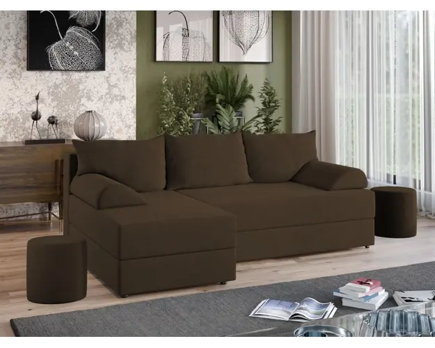 Coltar Mia Maro Chic, cu un design minimalist, Coltar Mia Maro creeaza un ambient cald, primitor si este ideal pentru un hol sau living de dimensiuni medii sau mari. Coltarul se transforma rapid si usor intr-un pat spatios de 210 x 135 cm prin tragerea sezutului si rabatarea spatarului. Lada integrata este ideala pentru depozitarea lenjeriei, a pernelor sau a paturii si pentru a pastra la indemana toate articolele frecvent utilizate. Cele 3 perne si bratele detasabile ofera un confort sporit in orice moment. Acesta are dimensiunea de: 210 cm lungime, 135 cm latime, 70 cm inaltime totala . Este tapitat cu stofa de calitate pe diverse culori. Atentie: Pretul afisat nu include alte accesorii sau obiecte de decor (pernele deco, tablouri, elemente de iluminat, covor etc.). Taburetele se pot achizitiona optional. Livrare gratuita si rapida, 4-10 zile lucratoare prin flota proprie Suntem producatori de tapiterii, fara intermediari Toate piesele de tapiterii au o garantie de 2 ani Sezutul si extensia coltarului sunt pe relaxa (arcuri elicoidale si poliuretan) . Scheletul este rezistent, realizat pe structura solida de fag si pal. Extensia este de tip Doppelliege, ce prezinta un sistem actionat prin role, astfel ca partea de sezut se trage si permite partii de spatar sa gliseze spre partea din fata si sa se pozitioneze orizontal. Coltar Mia Maro se incadreaza cu usurinta in majoritatea locuintelor indiferent de stilul acestora. Puteti alege din mai multe culori pentru stofa. Produsele disponibile le puteti vedea aici Modele Mia . Dimensiuni Coltar Mia Maro Lungime: 210 cm Latime: 135 cm Inaltime sezut: 40 cm Inaltime : 70 cm Adancime sezut: 80 cm Adancime sezlon 120 cm Dimensiuni extins Lungime extins: 210 cm Adancime extins: 135 cm Dimensiuni brate Inaltime brate: 15 cm Latime brate: 35 cm Lungime brate: 75 cm Tapiterie Coltar Mia Maro Tapiteria produsului este din stofa Maro . Nuanta acestui produs nu este pretentioasa, mascheaza eventualele evenimente neplacute prin care se poate murdari sau pata si se integreaza perfect in majoritatea locuintelor. Intretinere: se recomanda ca praful sa se stearga cu un material textil moale (finet) umed si sa nu se curete cu agenti chimici (diluant, acetona). Imaginile sunt cu titlu de prezentare si pot avea mici diferente de nuante in functie de display. Dimensiunile sunt exprimate in centimetri si pot oscila intre ± 50 mm. Produsul cu denumirea Coltar Mia Maro face parte din brandul Mobila laguna, se afla in categoria Canapele extensibile si subcategoria