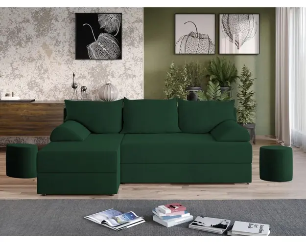 Coltar Mia Verde Chic, cu un design minimalist, Coltar Mia Verde creeaza un ambient cald, primitor si este ideal pentru un hol sau living de dimensiuni medii sau mari. Coltarul se transforma rapid si usor intr-un pat spatios de 210 x 135 cm prin tragerea sezutului si rabatarea spatarului. Lada integrata este ideala pentru depozitarea lenjeriei, a pernelor sau a paturii si pentru a pastra la indemana toate articolele frecvent utilizate. Cele 3 perne si bratele detasabile ofera un confort sporit in orice moment. Acesta are dimensiunea de: 210 cm lungime, 135 cm latime, 70 cm inaltime totala . Este tapitat cu stofa de calitate pe diverse culori. Atentie: Pretul afisat nu include alte accesorii sau obiecte de decor (pernele deco, tablouri, elemente de iluminat, covor etc.). Taburetele se pot achizitiona optional. Livrare gratuita si rapida, 4-10 zile lucratoare prin flota proprie Suntem producatori de tapiterii, fara intermediari Toate piesele de tapiterii au o garantie de 2 ani Sezutul si extensia coltarului sunt pe relaxa (arcuri elicoidale si poliuretan) . Scheletul este rezistent, realizat pe structura solida de fag si pal. Extensia este de tip Doppelliege, ce prezinta un sistem actionat prin role, astfel ca partea de sezut se trage si permite partii de spatar sa gliseze spre partea din fata si sa se pozitioneze orizontal. Coltar Mia Verde se incadreaza cu usurinta in majoritatea locuintelor indiferent de stilul acestora. Puteti alege din mai multe culori pentru stofa. Produsele disponibile le puteti vedea aici Modele Mia . Dimensiuni Coltar Mia Verde Lungime: 210 cm Latime: 135 cm Inaltime sezut: 40 cm Inaltime : 70 cm Adancime sezut: 80 cm Adancime sezlon 120 cm Dimensiuni extins Lungime extins: 210 cm Adancime extins: 135 cm Dimensiuni brate Inaltime brate: 15 cm Latime brate: 35 cm Lungime brate: 75 cm Tapiterie Coltar Mia Verde Tapiteria produsului este din stofa Verde . Nuanta acestui produs nu este pretentioasa, mascheaza eventualele evenimente neplacute prin care se poate murdari sau pata si se integreaza perfect in majoritatea locuintelor. Intretinere: se recomanda ca praful sa se stearga cu un material textil moale (finet) umed si sa nu se curete cu agenti chimici (diluant, acetona). Imaginile sunt cu titlu de prezentare si pot avea mici diferente de nuante in functie de display. Dimensiunile sunt exprimate in centimetri si pot oscila intre ± 50 mm. Produsul cu denumirea Coltar Mia Verde face parte din brandul Mobila laguna, se afla in categoria Canapele extensibile si subcategoria