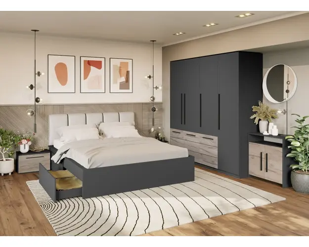Dulap 0.51m Noce Gri Dulapul pentru dormitor are 1 usa. Interiorul este compartimentat cu 4 etajere ca in imaginea alaturata. Este spatios iar dimensiunile sunt gandite cat sa incapa si in camere mai putin inalte sau mansarde. Finisajul gri antracit creeaza un ambient modern si atractiv. Schita montaj Dulap 0.51m Noce Gri Dimensiuni Dulap Lungime: 51 cm Adancime: 53 cm Inaltime: 199 cm Livrare rapida prin flota proprie Suntem producatori de mobilier Toate corpurile au o garantie de 2 ani Video de prezentare familie Videoul de prezentare poate contine mai multe corpuri de mobilier sau mai putine in comparatie cu produsul de pe aceasta pagina. Scopul acestui video este de a detalia aspectul materialelor, accesoriilor cat si a familiei din care face parte. Dulap 0.51m Noce Gri Dulapul cu o usa tip soldat face parte din familia de mobila pentru dormitor Noce . Mobileaza un dormitor rapid si usor. Are tot ce ii trebuie: noptiere, comoda, dulapuri de haine si pat tapitat sau netapitat. O solutie ideala pentru un dormitor matrimonial. Poti alege din 3 tipuri de corpuri pentru dulap si le poti combina in functie de lungimea si aspectul dorit. Un alt plus al acestui dormitor este dat de patul cu pana la 4 sertare pentru depozitare si tapiteria din piele pentru confort sporit. Acestea sunt construite din PAL Kronospan melaminat cu finisaj Gri Antracit si Stejar K02, o textura similara lemnului, care creeaza un contrast rafinat si un ambient placut. Cantul aplicat este unul de 0,6 ce le permite muchiilor sa fie placute la atingere fiind finisate si atent retusate. Pretul afisat nu include alte accesorii sau obiecte de decor (tablouri, elemente de iluminat, asternuturi, covor etc.) Produsul se livreaza demontat si este insotit de accesorii si instructiuni de asamblare. Dimensiunile sunt exprimate in cm si pot oscila intre ± 10 mm. Produsul cu denumirea Dulap 0.51m Noce Gri face parte din brandul Mobila laguna, se afla in categoria Seturi dormitor si subcategoria