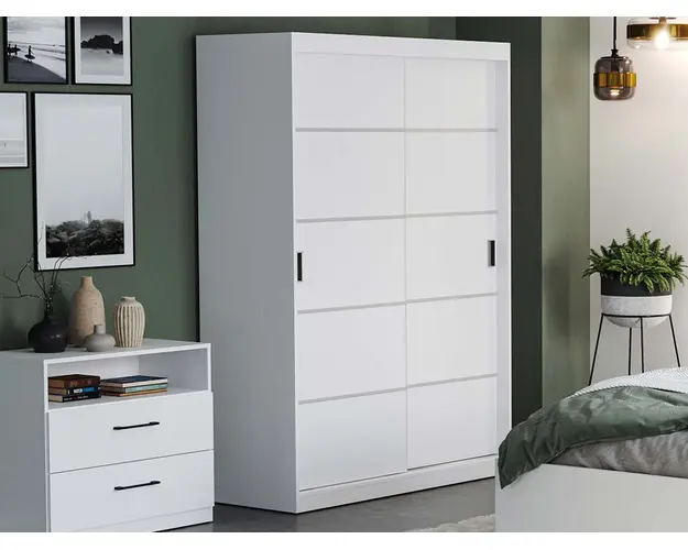 Dulap Nordis 138 usi albe Dulapul are un design luminos ce ofera camerei un aspect curat si aerisit. Dulap Nordis 138 usi albe imbina intr-un mod armonios latura practica cu cea estetica, avand compartimentare cu 5 polite si 2 bare de haine, iar optional se poate adauga unul sau pana la trei kituri a cate 2 sertare , aceastea pot fi integrate in zona de polite din partea stanga. Finisajul alb creeaza un ambient modern si atractiv in combinatie cu manerele negre. Usile sunt glisante si nu necesita spatiu exterior suplimentar pentru deschidere, acestea pot fi puse in orice ordine doriti . Sistemul de glisare este metalic. Usile prezinta pe suprafata lor baghete orizontale cu finisaj gri mat, acestea se pot aplica optional in functie de dorinta clientului la montaj. Se pot aplica in pozitia propusa de noi sau in orice pozitie doriti. SCHITA MONTAJ DULAP 138 SCHITA MONTAJ KIT SERTARE Dimensiuni Dulap usi glisante Latime: 138 cm Adancime: 55 cm Inaltime: 194.8 cm Video de prezentare familie Videoul de prezentare poate contine mai multe corpuri de mobilier sau mai putine in comparatie cu produsul de pe aceasta pagina. Scopul acestui video este de a detalia aspectul materialelor, accesoriilor cat si a familiei din care face parte. Livrare Gratuita prin flota proprie Preturi de producator Toate corpurile au o garantie de 2 ani Dulap Nordis 138 usi albe Dulapul cu usi glisante face parte din familia de mobila pentru dormitor Nordis ce are dulapuri cu usi glisante cu dimensiuni generoase si este proiectat pe mai multe latimi . O varianta mai ingusta pentru camere mici si medii si mai multe variante extinse pentru camere mai mari. Restul corpurilor de mobilier, comoda, noptiere si pat ofera la randul sau spatii de depozitarea in completarea dulapului prin sertare . Deasemenea puteti alege seturi cu pat ce au spatarul tapitat sau simplu. Cu posibilitatea de a adauga doua sau patru lazi de depozitare si cu trei dimensiuni de 140, 160, 180×200. Acestea sunt construite din PAL melaminat cu finisaj Alb, care creeaza un aspect rafinat si un ambient placut. Cantul aplicat este unul de 0,6 ce le permite muchiilor sa fie placute la atingere fiind finisate si atent retusate. Pretul afisat nu include alte accesorii sau obiecte de decor (tablouri, elemente de iluminat, asternuturi, covor etc.) Produsul se livreaza demontat si este insotit de accesorii si instructiuni de asamblare. Dimensiunile sunt exprimate in cm si pot oscila intre ± 10 mm. Produsul cu denumirea Dulap Nordis 138 usi albe face parte din brandul Mobila laguna, se afla in categoria Oferte exclusiv online si subcategoria
