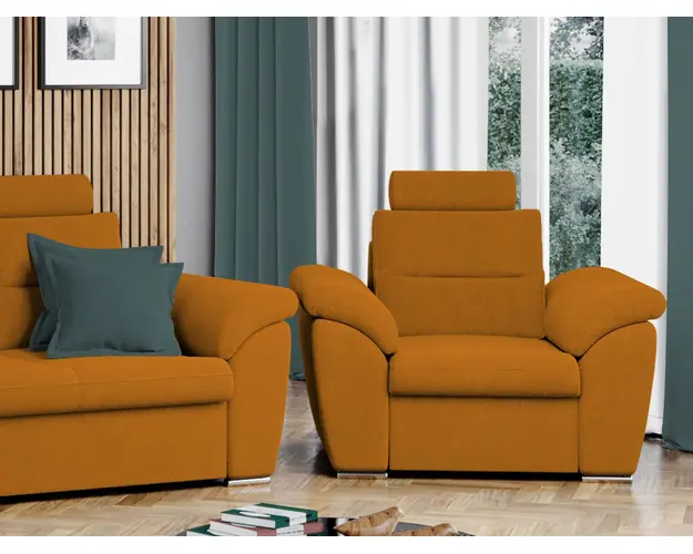 Fotoliu Biano Portocaliu Fotoliu Biano Portocaliu are un design modern , contemporan si un aspect impunator, caracterizat de forme rotunjite si simple. Poti avea parte de relaxare completa si un confort sporit, gratie tetierei reglabile , spatarului si bratelor care ofera sustinere corpului tau exact in pozitia dorita. Are dimensiunile de: 120 cm lungime, 90 cm latime, 105 cm inaltime totala . Este tapitat cu stofa de calitate pe diverse culori. Atentie: Pretul afisat nu include alte accesorii sau obiecte de decor (pernele deco, tablouri, elemente de iluminat, covor etc.). Taburetele se pot achizitiona optional. Livrare gratuita si rapida, 4-10 zile lucratoare prin flota proprie Suntem producatori de tapiterii, fara intermediari, Toate piesele de tapiterii au o garantie de 2 ani Ofera fermitatea optima, dar si confortul dorit prin sezutul fotoliului care este pe relaxa (arcuri elicoidale si poliuretan) . Scheletul este rezistent, realizat pe structura solida de fag si pal . Fotoliu Biano Portocaliu se incadreaza cu usurinta in majoritatea locuintelor indiferent de stilul acestora. Puteti alege din mai multe culori pentru stofa. Produsele disponibile le puteti vedea aici Modele Biano . Dimensiuni Fotoliu Biano Latime: 120 cm Adancime: 90 cm Inaltime: 105 cm Latime intre brate: 58 cm Inaltime sezut: 45 cm Inaltime spatar cu tetiere: 65 cm Inaltime spatar fara tetiere: 50 cm Adancime sezut: 60 cm Lungime brate: 87 cm Tapiterie Fotoliu Biano Portocaliu Tapiteria produsului este din stofa Portocalie. Nuanta acestui produs nu este pretentioasa, mascheaza eventualele evenimente neplacute prin care se poate murdari sau pata si se integreaza perfect in majoritatea locuintelor. Intretinere: se recomanda ca praful sa se stearga cu un material textil moale (finet) umed si sa nu se curete cu agenti chimici (diluant, acetona). Imaginile sunt cu titlu de prezentare si pot avea mici diferente de nuante in functie de display. Dimensiunile sunt exprimate in centimetri si pot oscila intre ± 50 mm. Produsul cu denumirea Fotoliu Biano Portocaliu face parte din brandul Mobila laguna, se afla in categoria Fotolii si subcategoria