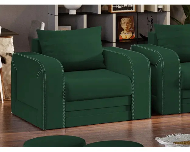 Fotoliu Camila Verde Fotoliu Camila Verde este piesa de mobilier ce va completa cu siguranta casa voastra, oferindu-va spatiul necesar indiferent de situatie. Formele rotunjite ale manerelor si al sezutului adauga un plus de confort acestui fotoliu. Butonii de pe sezut dau un plus de eleganta si stil oricarui living. Te poti aseza astfel incat sa te simti bine si relaxat timp de multe ore, gratie pernei detasabile pentru spatar, care ofera sustinere corpului tau exact in pozitia dorita. Are dimensiunea de: 97 cm lungime, 90 cm latime, 80 cm inaltime totala. Este tapitat cu stofa de calitate pe diverse culori. Atentie: Pretul afisat nu include alte accesorii sau obiecte de decor (pernele deco, tablouri, elemente de iluminat, covor etc.). Taburetele se pot achizitiona optional. Livrare gratuita si rapida, 4-10 zile lucratoare prin flota proprie Suntem producatori de tapiterii, fara intermediari, Toate piesele de tapiterii au o garantie de 2 ani Ofera fermitatea optima, dar si confortul dorit prin sezutul fotoliului care este pe relaxa (arcuri elicoidale si poliuretan) . Scheletul este rezistent, realizat pe structura solida de fag si pal . Fotoliu Camila Verde se incadreaza cu usurinta in majoritatea locuintelor indiferent de stilul acestora. Puteti alege din mai multe culori pentru stofa. Produsele disponibile le puteti vedea aici Modele Camila . Dimensiuni Fotoliu Camila Latime: 97 cm Adancime: 90 cm Inaltime: 80 cm Latime intre brate:60 cm Adancime sezut: 80 cm Inaltime sezut: 47 cm Inaltime perna: 50 cm Grosime brate: 17 cm Tapiterie Fotoliu Camila Verde Tapiteria produsului este din stofa Verde. Nuanta acestui produs nu este pretentioasa, mascheaza eventualele evenimente neplacute prin care se poate murdari sau pata si se integreaza perfect in majoritatea locuintelor. Intretinere: se recomanda ca praful sa se stearga cu un material textil moale (finet) umed si sa nu se curete cu agenti chimici (diluant, acetona). Imaginile sunt cu titlu de prezentare si pot avea mici diferente de nuante in functie de display. Dimensiunile sunt exprimate in centimetri si pot oscila intre ± 50 mm. Produsul cu denumirea Fotoliu Camila Verde face parte din brandul Mobila laguna, se afla in categoria Fotolii si subcategoria