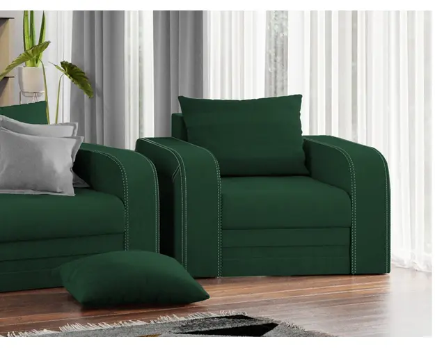 Fotoliu Camila Verde Fotoliu Camila Verde este piesa de mobilier ce va completa cu siguranta casa voastra, oferindu-va spatiul necesar indiferent de situatie. Formele rotunjite ale manerelor si al sezutului adauga un plus de confort acestui fotoliu. Butonii de pe sezut dau un plus de eleganta si stil oricarui living. Te poti aseza astfel incat sa te simti bine si relaxat timp de multe ore, gratie pernei detasabile pentru spatar, care ofera sustinere corpului tau exact in pozitia dorita. Are dimensiunea de: 97 cm lungime, 90 cm latime, 80 cm inaltime totala. Este tapitat cu stofa de calitate pe diverse culori. Atentie: Pretul afisat nu include alte accesorii sau obiecte de decor (pernele deco, tablouri, elemente de iluminat, covor etc.). Taburetele se pot achizitiona optional. Livrare gratuita si rapida, 4-10 zile lucratoare prin flota proprie Suntem producatori de tapiterii, fara intermediari, Toate piesele de tapiterii au o garantie de 2 ani Ofera fermitatea optima, dar si confortul dorit prin sezutul fotoliului care este pe relaxa (arcuri elicoidale si poliuretan) . Scheletul este rezistent, realizat pe structura solida de fag si pal . Fotoliu Camila Verde se incadreaza cu usurinta in majoritatea locuintelor indiferent de stilul acestora. Puteti alege din mai multe culori pentru stofa. Produsele disponibile le puteti vedea aici Modele Camila . Dimensiuni Fotoliu Camila Latime: 97 cm Adancime: 90 cm Inaltime: 80 cm Latime intre brate:60 cm Adancime sezut: 80 cm Inaltime sezut: 47 cm Inaltime perna: 50 cm Grosime brate: 17 cm Tapiterie Fotoliu Camila Verde Tapiteria produsului este din stofa Verde. Nuanta acestui produs nu este pretentioasa, mascheaza eventualele evenimente neplacute prin care se poate murdari sau pata si se integreaza perfect in majoritatea locuintelor. Intretinere: se recomanda ca praful sa se stearga cu un material textil moale (finet) umed si sa nu se curete cu agenti chimici (diluant, acetona). Imaginile sunt cu titlu de prezentare si pot avea mici diferente de nuante in functie de display. Dimensiunile sunt exprimate in centimetri si pot oscila intre ± 50 mm. Produsul cu denumirea Fotoliu Camila Verde face parte din brandul Mobila laguna, se afla in categoria Fotolii si subcategoria
