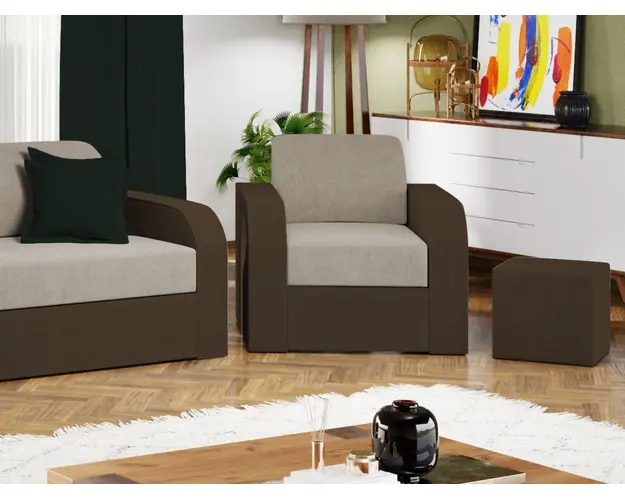 Fotoliu Mini Crem / Maro Fotoliu Mini Crem / Maro are un design minimalist, cu bratele si spatarul rotunjite. Datorita aspectului se poate integra in orice tip de locuinta indiferent de stilul acesteia. Fotoliul are dimensiunile de: 90 cm lungime, 84 cm latime, 83 cm inaltime totala . Este tapitat cu stofa de calitate pe diverse culori. Atentie: Pretul afisat nu include alte accesorii sau obiecte de decor (pernele deco, tablouri, elemente de iluminat, covor etc.). Taburetele se pot achizitiona optional. Livrare gratuita si rapida, 4-10 zile lucratoare prin flota proprie Suntem producatori de tapiterii, fara intermediari, Toate piesele de tapiterii au o garantie de 2 ani Sezutul fotoliului este din arcuri elicoidale si poliuretan . Scheletul este rezistent, realizat pe structura solida de fag si pal . Fotoliu Mini se incadreaza cu usurinta in majoritatea locuintelor indiferent de stilul acestora. Puteti alege din mai multe culori pentru stofa. Produsele disponibile le puteti vedea aici Modele Mini . Dimensiuni Fotoliu Mini Latime: 90cm Adancime: 84cm Inaltime: 83cm Adancime sezut: 54cm Inaltime sezut: 44cm Inaltime spatar: 45cm Dimensiuni brate Inaltime brate: 60cm Lungime brate: 84cm Grosime brate: 17cm Tapiterie Fotoliu Mini Crem / Maro Tapiteria produsului este din stofa Crem si Maro . Nuantele acestui produs nu sunt pretentioase, mascheaza eventualele evenimente neplacute prin care se pot murdari sau pata si se integreaza perfect in majoritatea locuintelor. Intretinere: se recomanda ca praful sa se stearga cu un material textil moale (finet) umed si sa nu se curete cu agenti chimici (diluant, acetona). Imaginile sunt cu titlu de prezentare si pot avea mici diferente de nuante in functie de display. Dimensiunile sunt exprimate in centimetri si pot oscila intre ± 50 mm. Produsul cu denumirea Fotoliu Mini Crem / Maro face parte din brandul Mobila laguna, se afla in categoria Fotolii si subcategoria