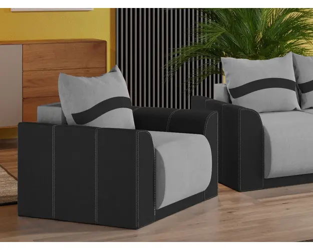 Fotoliu Nova Gri Deschis / Gri Antracit Fotoliu Nova Gri Deschis / Gri Antracit are un aspect aparte dat de liniile curbate de la sezut, brate si modelul pernei. Spatarul are o perna detasabila cu 2 fete, o fata cu model si una in culoare uni. Bratele si sezutul sunt rotunjite conferind un suport anatomic pentru maini si picioare. Te poti aseza astfel incat sa te simti bine si relaxat timp de multe ore, gratie pernei detasabile pentru spatar, care ofera sustinere corpului tau exact in pozitia dorita. Acesta are dimensiunea de: 88 cm lungime, 106 cm latime, 87 cm inaltime totala . Este tapitat cu stofa de calitate pe diverse culori. Atentie: Pretul afisat nu include alte accesorii sau obiecte de decor (pernele deco, tablouri, elemente de iluminat, covor etc.). Taburetele se pot achizitiona optional. Livrare gratuita si rapida, 4-10 zile lucratoare prin flota proprie Suntem producatori de tapiterii, fara intermediari, Toate piesele de tapiterii au o garantie de 2 ani Ofera fermitatea optima, dar si confortul dorit prin sezutul fotoliului care este pe relaxa (arcuri elicoidale si poliuretan) . Scheletul este rezistent, realizat pe structura solida de fag si pal . Fotoliu Nova Gri Deschis / Gri Antracit se incadreaza cu usurinta in majoritatea locuintelor indiferent de stilul acestora. Puteti alege din mai multe culori pentru stofa. Produsele disponibile le puteti vedea aici Modele Nova . Dimensiuni Fotoliu Nova Latime: 88 cm Adancime: 106 cm Inaltime: 87 cm Latime intre brate: 48 cm Adancime sezut: 85 cm Inaltime sezut: 46 cm Inaltime perna: 45 cm Dimensiuni brate Inaltime brate: 63 cm Lungime brate: 106 cm Grosime brate: 20 cm Tapiterie Fotoliu Nova Gri Deschis / Gri Antracit Tapiteria produsului este din stofa Gri Deschis si Gri Antracit . Nuantele acestui produs nu sunt pretentioase, mascheaza eventualele evenimente neplacute prin care se pot murdari sau pata si se integreaza perfect in majoritatea locuintelor. Intretinere: se recomanda ca praful sa se stearga cu un material textil moale (finet) umed si sa nu se curete cu agenti chimici (diluant, acetona). Imaginile sunt cu titlu de prezentare si pot avea mici diferente de nuante in functie de display. Dimensiunile sunt exprimate in centimetri si pot oscila intre ± 50 mm. Produsul cu denumirea Fotoliu Nova Gri Deschis / Gri Antracit face parte din brandul Mobila laguna, se afla in categoria Fotolii si subcategoria