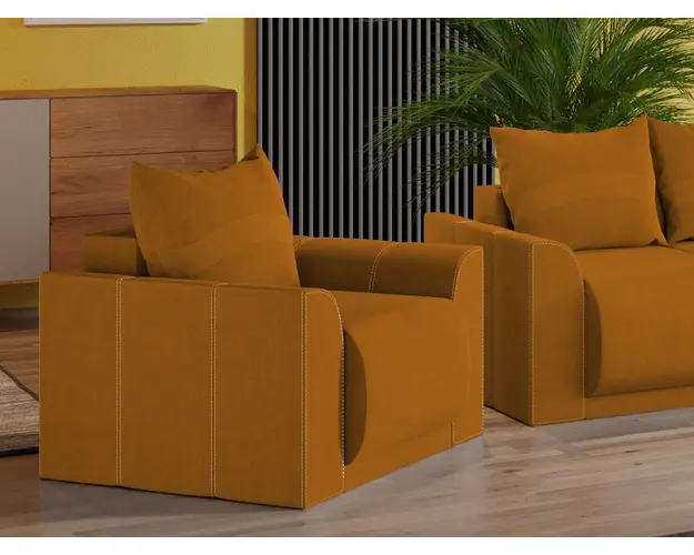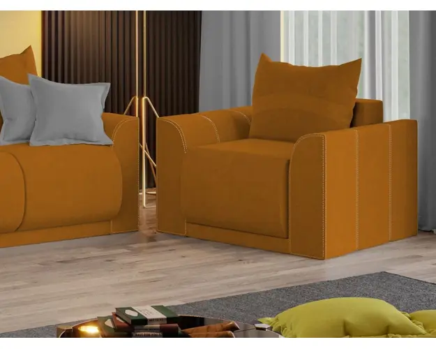 Fotoliu Nova Portocaliu Fotoliu Nova Portocaliu are un aspect aparte dat de liniile curbate de la sezut, brate si modelul pernei. Spatarul are o perna detasabila cu 2 fete, o fata cu model si una in culoare uni. Bratele si sezutul sunt rotunjite conferind un suport anatomic pentru maini si picioare. Te poti aseza astfel incat sa te simti bine si relaxat timp de multe ore, gratie pernei detasabile pentru spatar, care ofera sustinere corpului tau exact in pozitia dorita. Acesta are dimensiunea de: 88 cm lungime, 106 cm latime, 87 cm inaltime totala . Este tapitat cu stofa de calitate pe diverse culori. Atentie: Pretul afisat nu include alte accesorii sau obiecte de decor (pernele deco, tablouri, elemente de iluminat, covor etc.). Taburetele se pot achizitiona optional. Livrare gratuita si rapida, 4-10 zile lucratoare prin flota proprie Suntem producatori de tapiterii, fara intermediari, Toate piesele de tapiterii au o garantie de 2 ani Ofera fermitatea optima, dar si confortul dorit prin sezutul fotoliului care este pe relaxa (arcuri elicoidale si poliuretan) . Scheletul este rezistent, realizat pe structura solida de fag si pal . Fotoliu Nova Portocaliu se incadreaza cu usurinta in majoritatea locuintelor indiferent de stilul acestora. Puteti alege din mai multe culori pentru stofa. Produsele disponibile le puteti vedea aici Modele Nova . Dimensiuni Fotoliu Nova Latime: 88 cm Adancime: 106 cm Inaltime: 87 cm Latime intre brate: 48 cm Adancime sezut: 85 cm Inaltime sezut: 46 cm Inaltime perna: 45 cm Dimensiuni brate Inaltime brate: 63 cm Lungime brate: 106 cm Grosime brate: 20 cm Tapiterie Fotoliu Nova Portocaliu Tapiteria produsului este din stofa Portocalie. Nuanta acestui produs nu este pretentioasa, mascheaza eventualele evenimente neplacute prin care se poate murdari sau pata si se integreaza perfect in majoritatea locuintelor. Intretinere: se recomanda ca praful sa se stearga cu un material textil moale (finet) umed si sa nu se curete cu agenti chimici (diluant, acetona). Imaginile sunt cu titlu de prezentare si pot avea mici diferente de nuante in functie de display. Dimensiunile sunt exprimate in centimetri si pot oscila intre ± 50 mm. Produsul cu denumirea Fotoliu Nova Portocaliu face parte din brandul Mobila laguna, se afla in categoria Fotolii si subcategoria