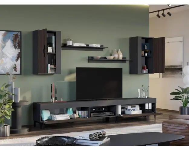 Living Azur C01 - Mobila sufragerie Living Azur C01 - Mobila sufragerie face parte din familia de mobila pentru sufragerie / living Azur . Aceasta colectie este alcatuita din mai multe module, care, prin combinatiile de materiale si culori, denota o eleganta si un rafinament aparte. Puteti alege direct din configuratiile realizate de noi sau, daca doriti, puteti creea singuri propria configuratie de living combinand corpurile de mobila astfel incat sa se potriveasca perfect in spatiul dorit. Livrare gratuita si rapida, 4-10 zile lucratoare prin flota proprie Suntem producatori de mobilier, fara intermediari Toate piesele de mobilier au o garantie de 2 ani Living Azur C01 - Mobila sufragerie Corpurile din gama Living Azur sunt construite din PAL melaminat de 16mm cu finisaj Gri Antracit si Nuc care, impreuna cu manerele si picioarele negre , creeaza un ambient primitor si o atmosfera placuta. Cantul aplicat este unul de 0,6 care le permite muchiilor sa fie placute la atingere. Atentie! Elementele de prindere de tipul dibluri, surub sau horsurub nu sunt incluse deoarce tipul de prindere difera in functie de tipul peretelui pe care urmeaza a se monta mobilierul (beton, caramida, BCA, rigips, lemn etc). Dimensiuni Living Azur C01 Imaginea alaturata prezinta compartimentarea pentru Living Azur C01 - Mobila sufragerie . Aceasta configuratie are 6 corpuri modulare , 4 suspendate si 2 pe sol. Spatii de depozitare cu usa cat si etajere si polite. Dimensiuni corpuri componente: Comoda TV 1000: L 100 x A 33.5 x H 43.7 cm - Schita Montaj Comoda TV 1600: L 160 x A 33.5 x H 43.7 cm - Schita Montaj 2 x Corp Superior: L 43.9 x A 26.6 x H 77 cm - Schita Montaj Set 2 Polite Suspendate: L 91.8 x A 18.6 x H 12 cm - Schita Montaj Inaltime picioare 12cm, este inclusa in dimensiunile corpurilor si dimensiunea totala. Dimensiuni totale livin L 260 x A 33.5 x H 170 cm (inaltimea poate varia in functie de inaltimea pentru care optati atunci cand suspendati corpurile superioare) Spatiul de TV: diagonala recomandata maxima 180cm/70" Toate corpurile se pot pune pe stanga sau pe dreapta in functie de cum doriti. Nu este obligatoriu pozitionarea ca in prezentare. Ele nu sunt prinse unul de celalalt. Pretul afisat nu include alte accesorii sau obiecte de decor (TV, tablouri, elemente de iluminat, covor etc.) Dimensiunile sunt exprimate in cm si pot oscila intre ± 10 mm. Living Azur C01 - Mobila sufragerie se livreaza demontat si este insotit de accesorii si instructiuni de asamblare. Produsul cu denumirea Living Azur C01 - Mobila sufragerie face parte din brandul Mobila laguna, se afla in categoria Mobila living si sufragerii si subcategoria