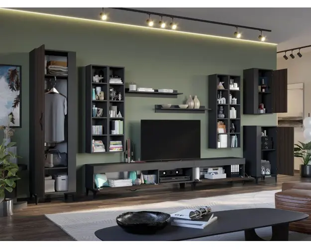Living Azur C10 - Mobila sufragerie Living Azur C10 - Mobila sufragerie face parte din familia de mobila pentru sufragerie / living Azur . Aceasta colectie este alcatuita din mai multe module, care, prin combinatiile de materiale si culori, denota o eleganta si un rafinament aparte. Puteti alege direct din configuratiile realizate de noi sau, daca doriti, puteti creea singuri propria configuratie de living combinand corpurile de mobila astfel incat sa se potriveasca perfect in spatiul dorit. Livrare gratuita si rapida, 4-10 zile lucratoare prin flota proprie Suntem producatori de mobilier, fara intermediari Toate piesele de mobilier au o garantie de 2 ani Living Azur C10 - Mobila sufragerie Corpurile din gama Living Azur sunt construite din PAL melaminat de 16mm cu finisaj Gri Antracit si Nuc care, impreuna cu manerele si picioarele negre , creeaza un ambient primitor si o atmosfera placuta. Cantul aplicat este unul de 0,6 care le permite muchiilor sa fie placute la atingere. Atentie! Elementele de prindere de tipul dibluri, surub sau horsurub nu sunt incluse deoarce tipul de prindere difera in functie de tipul peretelui pe care urmeaza a se monta mobilierul (beton, caramida, BCA, rigips, lemn etc). Dimensiuni Living Azur C10 Imaginea alaturata prezinta compartimentarea pentru Living Azur C10 - Mobila sufragerie . Aceasta configuratie are 11 corpuri modulare , 7 suspendate si 4 pe sol. Spatii de depozitare cu usa cat si etajere si polite. Dulapul are o bara de haine. Dimensiuni corpuri componente: Dulap Haine: L 51.6 x A 35.1 x H 192.4 cm Schita Montaj Comoda TV 1000: L 100 x A 33.5 x H 43.7 cm - Schita Montaj Comoda TV 1600: L 160 x A 33.5 x H 43.7 cm - Schita Montaj Corp Inferior: L 48 x A 33.6 x H 96.8 cm Schita Montaj Corp Superior: L 43.9 x A 26.6 x H 77 cm Schita Montaj 4 x Corp Decorativ cu Polite: L 120 x A 22 x H 25 cm Schita Montaj Set 2 Polite Suspendate: L 91.8 x A 18.6 x H 12 cm Schita Montaj Inaltime picioare 12cm, este inclusa in dimensiunile corpurilor si dimensiunea totala. Dimensiuni totale livin L 390 x A 35.1 x H 192.4 cm (inaltimea poate varia in functie de inaltimea pentru care optati atunci cand suspendati corpurile superioare) Spatiul de TV: diagonala recomandata maxima 180cm/70" Toate corpurile se pot pune pe stanga sau pe dreapta in functie de cum doriti. Nu este obligatoriu pozitionarea ca in prezentare. Ele nu sunt prinse unul de celalalt. Pretul afisat nu include alte accesorii sau obiecte de decor (TV, tablouri, elemente de iluminat, covor etc.) Dimensiunile sunt exprimate in cm si pot oscila intre ± 10 mm. Living Azur C10 - Mobila sufragerie se livreaza demontat si este insotit de accesorii si instructiuni de asamblare. Produsul cu denumirea Living Azur C10 - Mobila sufragerie face parte din brandul Mobila laguna, se afla in categoria Mobila living si sufragerii si subcategoria