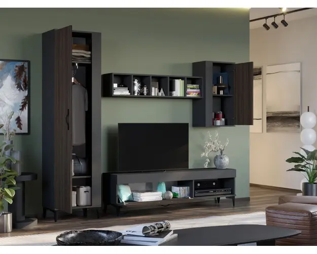 Living Azur C13 - Mobila sufragerie Living Azur C13 - Mobila sufragerie face parte din familia de mobila pentru sufragerie / living Azur . Aceasta colectie este alcatuita din mai multe module, care, prin combinatiile de materiale si culori, denota o eleganta si un rafinament aparte. Puteti alege direct din configuratiile realizate de noi sau, daca doriti, puteti creea singuri propria configuratie de living combinand corpurile de mobila astfel incat sa se potriveasca perfect in spatiul dorit. Livrare gratuita si rapida, 4-10 zile lucratoare prin flota proprie Suntem producatori de mobilier, fara intermediari Toate piesele de mobilier au o garantie de 2 ani Living Azur C13 - Mobila sufragerie Corpurile din gama Living Azur sunt construite din PAL melaminat de 16mm cu finisaj Gri Antracit si Nuc care, impreuna cu manerele si picioarele negre , creeaza un ambient primitor si o atmosfera placuta. Cantul aplicat este unul de 0,6 care le permite muchiilor sa fie placute la atingere. Atentie! Elementele de prindere de tipul dibluri, surub sau horsurub nu sunt incluse deoarce tipul de prindere difera in functie de tipul peretelui pe care urmeaza a se monta mobilierul (beton, caramida, BCA, rigips, lemn etc). Dimensiuni Living Azur C13 Imaginea alaturata prezinta compartimentarea pentru Living Azur C13 - Mobila sufragerie . Aceasta configuratie are 4 corpuri modulare , 2 suspendate si 2 pe sol. Spatii de depozitare cu usa cat si etajere si polite. Dulapul are o bara de haine. Dimensiuni corpuri componente: Dulap Haine: L 51.6 x A 35.1 x H 192.4 cm Schita Montaj Comoda TV 1600: L 160 x A 33.5 x H 43.7 cm - Schita Montaj Corp Superior: L 43.9 x A 26.6 x H 77 cm Schita Montaj Corp Decorativ cu Polite: L 120 x A 22 x H 25 cm Schita Montaj Inaltime picioare 12cm, este inclusa in dimensiunile corpurilor si dimensiunea totala. Dimensiuni totale livin L 230 x A 35.1 x H 192.4 cm (inaltimea poate varia in functie de inaltimea pentru care optati atunci cand suspendati corpurile superioare) Spatiul de TV: diagonala recomandata maxima 180cm/70" Toate corpurile se pot pune pe stanga sau pe dreapta in functie de cum doriti. Nu este obligatoriu pozitionarea ca in prezentare. Ele nu sunt prinse unul de celalalt. Pretul afisat nu include alte accesorii sau obiecte de decor (TV, tablouri, elemente de iluminat, covor etc.) Dimensiunile sunt exprimate in cm si pot oscila intre ± 10 mm. Living Azur C13 - Mobila sufragerie se livreaza demontat si este insotit de accesorii si instructiuni de asamblare. Produsul cu denumirea Living Azur C13 - Mobila sufragerie face parte din brandul Mobila laguna, se afla in categoria Mobila living si sufragerii si subcategoria