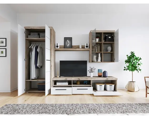 Living Balance Configuratia 5 Living Balance Configuratia 5 face parte dintr-o categorie de mobilier modern, contemporan ce imbina designul cu utilitatea. Este compus din corpuri modulare si poate fi comandat direct configurat sau pe corpuri. Livrare gratuita si rapida, 4-10 zile lucratoare prin flota proprie Suntem producatori de mobilier, fara intermediari Toate piesele de mobilier au o garantie de 2 ani Mobila Sufragerie Balance Corpurile sunt construite din PAL melaminat cu grosimea de 16mm cu finisaj San Remo si Alb . O combinatie de nuante in voga ce creeaza un ambient placut alaturi de elemntele de sticla si manerele negre. Cantul aplicat este unul de 0,6 care le permite muchiilor sa fie placute la atingere fiind finisate si atent retusate. Video de prezentare familie Videoul de prezentare poate contine mai multe corpuri de mobilier sau mai putine in comparatie cu produsul de pe aceasta pagina. Scopul acestui video este de a detalia aspectul materialelor, accesoriilor cat si a familiei din care face parte. Dimensiuni Living Balance Configuratia 5 Imaginea alaturata prezinta compartimentarea pentru Living Balance Configuratia 5 . Aceasta configuratie are 4 corpuri modulare , 2 suspendate si 2 nesuspendate si spatii de depozitare cu usa, cat si etajere si polite. Dimensiuni corpuri componente: Dulap 2U Balance Modul B : L 85 x A 52 x H 199.8 cm Schita Montaj Comoda Tv Balance Modul C : L 198 x A 55.6 x H 42.4 cm Schita Montaj Comoda inalta Balance Modul D : L 79 x A 38.4 x H 102.4 cm Schita Montaj Polita mica Balance Modul F : L 119.2 x A 23.2 x H 20 cm Schita Montaj Dimensiuni totale livin L 283 x A 55.6 x H 199.8 cm (inaltimea poate varia in functie de inaltimea pentru care optati atunci cand suspendati corpurile superioare) Spatiul de TV: diagonala recomandata maxima 120cm / 48″ ( latime spatiu TV 119 cm ) Toate corpurile se pot pune pe stanga sau pe dreapta in functie de cum doriti. Nu este obligatoriu pozitionarea ca in prezentare. Ele nu sunt prinse unul de celalalt. Pretul afisat nu include alte accesorii sau obiecte de decor (TV, tablouri, elemente de iluminat, covor etc.) Dimensiunile sunt exprimate in cm si pot oscila intre ± 10 mm. Produsul se livreaza demontat si este insotit de accesorii si instructiuni de asamblare. Produsul cu denumirea Living Balance Configuratia 5 face parte din brandul Mobila laguna, se afla in categoria Mobila living si sufragerii si subcategoria