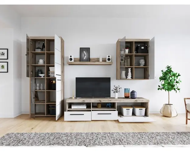 Living Balance Configuratia 6 Living Balance Configuratia 6 face parte dintr-o categorie de mobilier modern, contemporan ce imbina designul cu utilitatea. Este compus din corpuri modulare si poate fi comandat direct configurat sau pe corpuri. Livrare gratuita si rapida, 4-10 zile lucratoare prin flota proprie Suntem producatori de mobilier, fara intermediari Toate piesele de mobilier au o garantie de 2 ani Mobila Sufragerie Balance Corpurile sunt construite din PAL melaminat cu grosimea de 16mm cu finisaj San Remo si Alb . O combinatie de nuante in voga ce creeaza un ambient placut alaturi de elemntele de sticla si manerele negre. Cantul aplicat este unul de 0,6 care le permite muchiilor sa fie placute la atingere fiind finisate si atent retusate. Video de prezentare familie Videoul de prezentare poate contine mai multe corpuri de mobilier sau mai putine in comparatie cu produsul de pe aceasta pagina. Scopul acestui video este de a detalia aspectul materialelor, accesoriilor cat si a familiei din care face parte. Dimensiuni Living Balance Configuratia 6 Imaginea alaturata prezinta compartimentarea pentru Living Balance Configuratia 6 . Aceasta configuratie are 6 corpuri modulare , 3 suspendate si 3 nesuspendate si spatii de depozitare cu usa, cat si etajere si polite. Dimensiuni corpuri componente: Vitrina Balance Modul A : L 79 x A 38.4 x H 199.8 cm Schita Montaj Comoda Tv Balance Modul C : L 198 x A 55.6 x H 42.4 cm Schita Montaj Comoda inalta Balance Modul D : L 79 x A 38.4 x H 102.4 cm Schita Montaj Polita mica Balance Modul F : L 119.2 x A 23.2 x H 20 cm Schita Montaj Dimensiuni totale livin L 277 x A 55.6 x H 199.8 cm (inaltimea poate varia in functie de inaltimea pentru care optati atunci cand suspendati corpurile superioare) Spatiul de TV: diagonala recomandata maxima 120cm / 48″ ( latime spatiu TV 119 cm ) Toate corpurile se pot pune pe stanga sau pe dreapta in functie de cum doriti. Nu este obligatoriu pozitionarea ca in prezentare. Ele nu sunt prinse unul de celalalt. Pretul afisat nu include alte accesorii sau obiecte de decor (TV, tablouri, elemente de iluminat, covor etc.) Dimensiunile sunt exprimate in cm si pot oscila intre ± 10 mm. Produsul se livreaza demontat si este insotit de accesorii si instructiuni de asamblare. Produsul cu denumirea Living Balance Configuratia 6 face parte din brandul Mobila laguna, se afla in categoria Mobila living si sufragerii si subcategoria