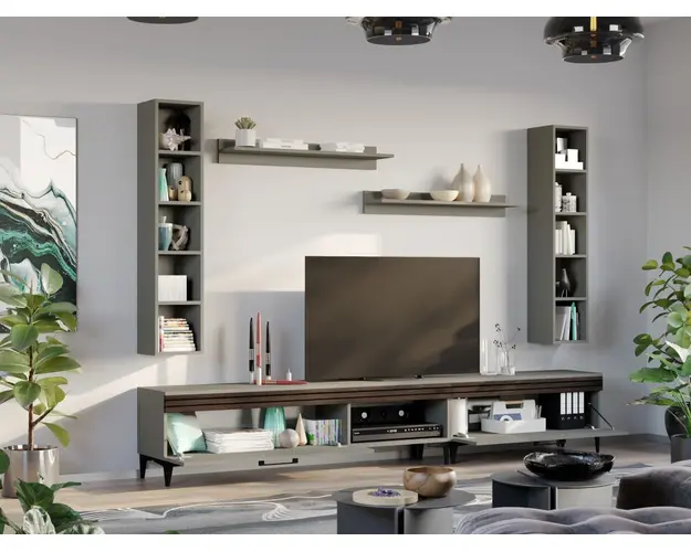 Living Nori C03 - Mobila sufragerie Living Nori C03 - Mobila sufragerie face parte din familia de mobila pentru sufragerie / living Nori . Aceasta colectie este alcatuita din mai multe module, care, prin combinatiile de materiale si culori, denota o eleganta si un rafinament aparte. Puteti alege direct din configuratiile realizate de noi sau, daca doriti, puteti creea singuri propria configuratie de living combinand corpurile de mobila astfel incat sa se potriveasca perfect in spatiul dorit. Livrare gratuita si rapida, 4-10 zile lucratoare prin flota proprie Suntem producatori de mobilier, fara intermediari Toate piesele de mobilier au o garantie de 2 ani Living Nori C03 - Mobila sufragerie Corpurile din gama Living Nori sunt construite din PAL melaminat de 16mm cu finisaj Casmir si Deep Line (cu aspect care imita riflajul) care, impreuna cu manerele si picioarele negre , creeaza un ambient primitor si o atmosfera placuta. Cantul aplicat este unul de 0,6 care le permite muchiilor sa fie placute la atingere. Atentie! Elementele de prindere de tipul dibluri, surub sau horsurub nu sunt incluse deoarce tipul de prindere difera in functie de tipul peretelui pe care urmeaza a se monta mobilierul (beton, caramida, BCA, rigips, lemn etc). Dimensiuni Living Nori C03 Imaginea alaturata prezinta compartimentarea pentru Living Nori C03 - Mobila sufragerie . Aceasta configuratie are 6 corpuri modulare , 4 suspendate si 2 pe sol. Spatii de depozitare cu usa cat si etajere si polite. Dimensiuni corpuri componente: Comoda TV 1000: L 100 x A 33.5 x H 43.7 cm - Schita Montaj Comoda TV 1600: L 160 x A 33.5 x H 43.7 cm - Schita Montaj 2 x Corp Decorativ cu Polite: L 120 x A 22 x H 25 cm - Schita Montaj Set 2 Polite Suspendate: L 91.8 x A 18.6 x H 12 cm Schita Montaj Inaltime picioare 12cm, este inclusa in dimensiunile corpurilor si dimensiunea totala. Dimensiuni totale livin L 260 x A 33.5 x H 170 cm (inaltimea poate varia in functie de inaltimea pentru care optati atunci cand suspendati corpurile superioare) Spatiul de TV: diagonala recomandata maxima 180cm/70" Toate corpurile se pot pune pe stanga sau pe dreapta in functie de cum doriti. Nu este obligatoriu pozitionarea ca in prezentare. Ele nu sunt prinse unul de celalalt. Pretul afisat nu include alte accesorii sau obiecte de decor (TV, tablouri, elemente de iluminat, covor etc.) Dimensiunile sunt exprimate in cm si pot oscila intre ± 10 mm. Living Nori C03 - Mobila sufragerie se livreaza demontat si este insotit de accesorii si instructiuni de asamblare. Produsul cu denumirea Living Nori C03 - Mobila sufragerie face parte din brandul Mobila laguna, se afla in categoria Mobila living si sufragerii si subcategoria