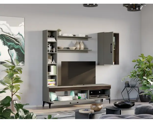 Living Nori C05 - Mobila sufragerie Living Nori C05 - Mobila sufragerie face parte din familia de mobila pentru sufragerie / living Nori . Aceasta colectie este alcatuita din mai multe module, care, prin combinatiile de materiale si culori, denota o eleganta si un rafinament aparte. Puteti alege direct din configuratiile realizate de noi sau, daca doriti, puteti creea singuri propria configuratie de living combinand corpurile de mobila astfel incat sa se potriveasca perfect in spatiul dorit. Livrare gratuita si rapida, 4-10 zile lucratoare prin flota proprie Suntem producatori de mobilier, fara intermediari Toate piesele de mobilier au o garantie de 2 ani Living Nori C05 - Mobila sufragerie Corpurile din gama Living Nori sunt construite din PAL melaminat de 16mm cu finisaj Casmir si Deep Line (cu aspect care imita riflajul) care, impreuna cu manerele si picioarele negre , creeaza un ambient primitor si o atmosfera placuta. Cantul aplicat este unul de 0,6 care le permite muchiilor sa fie placute la atingere. Atentie! Elementele de prindere de tipul dibluri, surub sau horsurub nu sunt incluse deoarce tipul de prindere difera in functie de tipul peretelui pe care urmeaza a se monta mobilierul (beton, caramida, BCA, rigips, lemn etc). Dimensiuni Living Nori C05 Imaginea alaturata prezinta compartimentarea pentru Living Nori C05 - Mobila sufragerie . Aceasta configuratie are 5 corpuri modulare , 4 suspendate si 1 pe sol. Spatii de depozitare cu usa cat si etajere si polite. Dimensiuni corpuri componente: Comoda TV 1600: L 160 x A 33.5 x H 43.7 cm - Schita Montaj Corp Superior: L 43.9 x A 26.6 x H 77 cm Schita Montaj Corp Decorativ cu Polite: L 120 x A 22 x H 25 cm - Schita Montaj Set 2 Polite Suspendate: L 91.8 x A 18.6 x H 12 cm Schita Montaj Inaltime picioare 12cm, este inclusa in dimensiunile corpurilor si dimensiunea totala. Dimensiuni totale livin L 180 x A 33.5 x H 170 cm (inaltimea poate varia in functie de inaltimea pentru care optati atunci cand suspendati corpurile superioare) Spatiul de TV: diagonala recomandata maxima 180cm/70" Toate corpurile se pot pune pe stanga sau pe dreapta in functie de cum doriti. Nu este obligatoriu pozitionarea ca in prezentare. Ele nu sunt prinse unul de celalalt. Pretul afisat nu include alte accesorii sau obiecte de decor (TV, tablouri, elemente de iluminat, covor etc.) Dimensiunile sunt exprimate in cm si pot oscila intre ± 10 mm. Living Nori C05 - Mobila sufragerie se livreaza demontat si este insotit de accesorii si instructiuni de asamblare. Produsul cu denumirea Living Nori C05 - Mobila sufragerie face parte din brandul Mobila laguna, se afla in categoria Mobila living si sufragerii si subcategoria