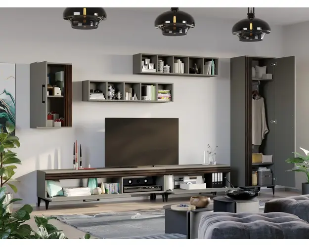 Living Nori C08 - Mobila sufragerie Living Nori C08 - Mobila sufragerie face parte din familia de mobila pentru sufragerie / living Nori . Aceasta colectie este alcatuita din mai multe module, care, prin combinatiile de materiale si culori, denota o eleganta si un rafinament aparte. Puteti alege direct din configuratiile realizate de noi sau, daca doriti, puteti creea singuri propria configuratie de living combinand corpurile de mobila astfel incat sa se potriveasca perfect in spatiul dorit. Livrare gratuita si rapida, 4-10 zile lucratoare prin flota proprie Suntem producatori de mobilier, fara intermediari Toate piesele de mobilier au o garantie de 2 ani Living Nori C08 - Mobila sufragerie Corpurile din gama Living Nori sunt construite din PAL melaminat de 16mm cu finisaj Casmir si Deep Line (cu aspect care imita riflajul) care, impreuna cu manerele si picioarele negre , creeaza un ambient primitor si o atmosfera placuta. Cantul aplicat este unul de 0,6 care le permite muchiilor sa fie placute la atingere. Atentie! Elementele de prindere de tipul dibluri, surub sau horsurub nu sunt incluse deoarce tipul de prindere difera in functie de tipul peretelui pe care urmeaza a se monta mobilierul (beton, caramida, BCA, rigips, lemn etc). Dimensiuni Living Nori C08 Imaginea alaturata prezinta compartimentarea pentru Living Nori C08 - Mobila sufragerie . Aceasta configuratie are 6 corpuri modulare , 3 suspendate si 3 pe sol. Spatii de depozitare cu usa cat si etajere si polite. Dulapul are o bara de haine. Dimensiuni corpuri componente: Dulap Haine: L 51.6 x A 35.1 x H 192.4 cm - Schita Montaj Comoda TV 1000: L 100 x A 33.5 x H 43.7 cm - Schita Montaj Comoda TV 1600: L 160 x A 33.5 x H 43.7 cm - Schita Montaj Corp Superior: L 43.9 x A 26.6 x H 77 cm Schita Montaj 2 x Corp Decorativ cu Polite: L 120 x A 22 x H 25 cm - Schita Montaj Inaltime picioare 12cm, este inclusa in dimensiunile corpurilor si dimensiunea totala. Dimensiuni totale livin L 320 x A 35.1 x H 192.4 cm (inaltimea poate varia in functie de inaltimea pentru care optati atunci cand suspendati corpurile superioare) Spatiul de TV: diagonala recomandata maxima 180cm/70" Toate corpurile se pot pune pe stanga sau pe dreapta in functie de cum doriti. Nu este obligatoriu pozitionarea ca in prezentare. Ele nu sunt prinse unul de celalalt. Pretul afisat nu include alte accesorii sau obiecte de decor (TV, tablouri, elemente de iluminat, covor etc.) Dimensiunile sunt exprimate in cm si pot oscila intre ± 10 mm. Living Nori C08 - Mobila sufragerie se livreaza demontat si este insotit de accesorii si instructiuni de asamblare. Produsul cu denumirea Living Nori C08 - Mobila sufragerie face parte din brandul Mobila laguna, se afla in categoria Mobila living si sufragerii si subcategoria