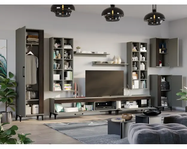 Living Nori C10 - Mobila sufragerie Living Nori C10 - Mobila sufragerie face parte din familia de mobila pentru sufragerie / living Nori . Aceasta colectie este alcatuita din mai multe module, care, prin combinatiile de materiale si culori, denota o eleganta si un rafinament aparte. Puteti alege direct din configuratiile realizate de noi sau, daca doriti, puteti creea singuri propria configuratie de living combinand corpurile de mobila astfel incat sa se potriveasca perfect in spatiul dorit. Livrare gratuita si rapida, 4-10 zile lucratoare prin flota proprie Suntem producatori de mobilier, fara intermediari Toate piesele de mobilier au o garantie de 2 ani Living Nori C10 - Mobila sufragerie Corpurile din gama Living Nori sunt construite din PAL melaminat de 16mm cu finisaj Casmir si Deep Line (cu aspect care imita riflajul) care, impreuna cu manerele si picioarele negre , creeaza un ambient primitor si o atmosfera placuta. Cantul aplicat este unul de 0,6 care le permite muchiilor sa fie placute la atingere. Atentie! Elementele de prindere de tipul dibluri, surub sau horsurub nu sunt incluse deoarce tipul de prindere difera in functie de tipul peretelui pe care urmeaza a se monta mobilierul (beton, caramida, BCA, rigips, lemn etc). Dimensiuni Living Nori C10 Imaginea alaturata prezinta compartimentarea pentru Living Nori C10 - Mobila sufragerie . Aceasta configuratie are 11 corpuri modulare , 7 suspendate si 4 pe sol. Spatii de depozitare cu usa cat si etajere si polite. Dulapul are o bara de haine. Dimensiuni corpuri componente: Dulap Haine: L 51.6 x A 35.1 x H 192.4 cm - Schita Montaj Comoda TV 1000: L 100 x A 33.5 x H 43.7 cm - Schita Montaj Comoda TV 1600: L 160 x A 33.5 x H 43.7 cm - Schita Montaj Corp Inferior: L 48 x A 33.6 x H 96.8 cm Schita Montaj Corp Superior: L 43.9 x A 26.6 x H 77 cm Schita Montaj 4 x Corp Decorativ cu Polite: L 120 x A 22 x H 25 cm - Schita Montaj Set 2 Polite Suspendate: L 91.8 x A 18.6 x H 12 cm Schita Montaj Inaltime picioare 12cm, este inclusa in dimensiunile corpurilor si dimensiunea totala. Dimensiuni totale livin L 390 x A 35.1 x H 192.4 cm (inaltimea poate varia in functie de inaltimea pentru care optati atunci cand suspendati corpurile superioare) Spatiul de TV: diagonala recomandata maxima 180cm/70" Toate corpurile se pot pune pe stanga sau pe dreapta in functie de cum doriti. Nu este obligatoriu pozitionarea ca in prezentare. Ele nu sunt prinse unul de celalalt. Pretul afisat nu include alte accesorii sau obiecte de decor (TV, tablouri, elemente de iluminat, covor etc.) Dimensiunile sunt exprimate in cm si pot oscila intre ± 10 mm. Living Nori C10 - Mobila sufragerie se livreaza demontat si este insotit de accesorii si instructiuni de asamblare. Produsul cu denumirea Living Nori C10 - Mobila sufragerie face parte din brandul Mobila laguna, se afla in categoria Mobila living si sufragerii si subcategoria