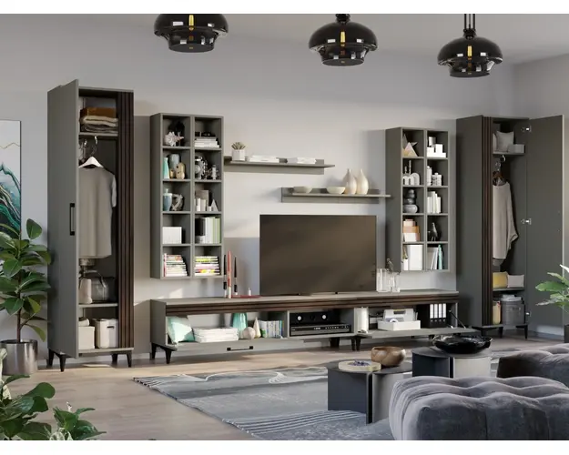 Living Nori C11 - Mobila sufragerie Living Nori C11 - Mobila sufragerie face parte din familia de mobila pentru sufragerie / living Nori . Aceasta colectie este alcatuita din mai multe module, care, prin combinatiile de materiale si culori, denota o eleganta si un rafinament aparte. Puteti alege direct din configuratiile realizate de noi sau, daca doriti, puteti creea singuri propria configuratie de living combinand corpurile de mobila astfel incat sa se potriveasca perfect in spatiul dorit. Livrare gratuita si rapida, 4-10 zile lucratoare prin flota proprie Suntem producatori de mobilier, fara intermediari Toate piesele de mobilier au o garantie de 2 ani Living Nori C11 - Mobila sufragerie Corpurile din gama Living Nori sunt construite din PAL melaminat de 16mm cu finisaj Casmir si Deep Line (cu aspect care imita riflajul) care, impreuna cu manerele si picioarele negre , creeaza un ambient primitor si o atmosfera placuta. Cantul aplicat este unul de 0,6 care le permite muchiilor sa fie placute la atingere. Atentie! Elementele de prindere de tipul dibluri, surub sau horsurub nu sunt incluse deoarce tipul de prindere difera in functie de tipul peretelui pe care urmeaza a se monta mobilierul (beton, caramida, BCA, rigips, lemn etc). Dimensiuni Living Nori C11 Imaginea alaturata prezinta compartimentarea pentru Living Nori C11 - Mobila sufragerie . Aceasta configuratie are 10 corpuri modulare , 6 suspendate si 4 pe sol. Spatii de depozitare cu usa cat si etajere si polite. Dulapurile au bare de haine. Dimensiuni corpuri componente: 2 x Dulap Haine: L 51.6 x A 35.1 x H 192.4 cm - Schita Montaj Comoda TV 1000: L 100 x A 33.5 x H 43.7 cm - Schita Montaj Comoda TV 1600: L 160 x A 33.5 x H 43.7 cm - Schita Montaj 4 x Corp Decorativ cu Polite: L 120 x A 22 x H 25 cm - Schita Montaj Set 2 Polite Suspendate: L 91.8 x A 18.6 x H 12 cm Schita Montaj Inaltime picioare 12cm, este inclusa in dimensiunile corpurilor si dimensiunea totala. Dimensiuni totale livin L 390 x A 35.1 x H 192.4 cm (inaltimea poate varia in functie de inaltimea pentru care optati atunci cand suspendati corpurile superioare) Spatiul de TV: diagonala recomandata maxima 180cm/70" Toate corpurile se pot pune pe stanga sau pe dreapta in functie de cum doriti. Nu este obligatoriu pozitionarea ca in prezentare. Ele nu sunt prinse unul de celalalt. Pretul afisat nu include alte accesorii sau obiecte de decor (TV, tablouri, elemente de iluminat, covor etc.) Dimensiunile sunt exprimate in cm si pot oscila intre ± 10 mm. Living Nori C11 - Mobila sufragerie se livreaza demontat si este insotit de accesorii si instructiuni de asamblare. Produsul cu denumirea Living Nori C11 - Mobila sufragerie face parte din brandul Mobila laguna, se afla in categoria Mobila living si sufragerii si subcategoria