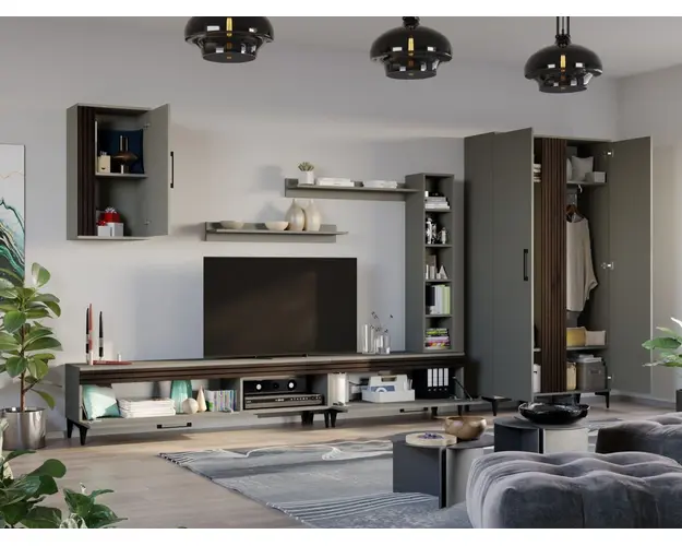 Living Nori C12 - Mobila sufragerie Living Nori C12 - Mobila sufragerie face parte din familia de mobila pentru sufragerie / living Nori . Aceasta colectie este alcatuita din mai multe module, care, prin combinatiile de materiale si culori, denota o eleganta si un rafinament aparte. Puteti alege direct din configuratiile realizate de noi sau, daca doriti, puteti creea singuri propria configuratie de living combinand corpurile de mobila astfel incat sa se potriveasca perfect in spatiul dorit. Livrare gratuita si rapida, 4-10 zile lucratoare prin flota proprie Suntem producatori de mobilier, fara intermediari Toate piesele de mobilier au o garantie de 2 ani Living Nori C12 - Mobila sufragerie Corpurile din gama Living Nori sunt construite din PAL melaminat de 16mm cu finisaj Casmir si Deep Line (cu aspect care imita riflajul) care, impreuna cu manerele si picioarele negre , creeaza un ambient primitor si o atmosfera placuta. Cantul aplicat este unul de 0,6 care le permite muchiilor sa fie placute la atingere. Atentie! Elementele de prindere de tipul dibluri, surub sau horsurub nu sunt incluse deoarce tipul de prindere difera in functie de tipul peretelui pe care urmeaza a se monta mobilierul (beton, caramida, BCA, rigips, lemn etc). Dimensiuni Living Nori C12 Imaginea alaturata prezinta compartimentarea pentru Living Nori C12 - Mobila sufragerie . Aceasta configuratie are 11 corpuri modulare , 7 suspendate si 4 pe sol. Spatii de depozitare cu usa cat si etajere si polite. Dulapurile au bare de haine. Dimensiuni corpuri componente: 2 x Dulap Haine: L 51.6 x A 35.1 x H 192.4 cm - Schita Montaj Comoda TV 1000: L 100 x A 33.5 x H 43.7 cm - Schita Montaj Comoda TV 1600: L 160 x A 33.5 x H 43.7 cm - Schita Montaj Corp Superior: L 43.9 x A 26.6 x H 77 cm Schita Montaj Corp Decorativ cu Polite: L 120 x A 22 x H 25 cm - Schita Montaj Set 2 Polite Suspendate: L 91.8 x A 18.6 x H 12 cm Schita Montaj Inaltime picioare 12cm, este inclusa in dimensiunile corpurilor si dimensiunea totala. Dimensiuni totale livin L 390 x A 35.1 x H 192.4 cm (inaltimea poate varia in functie de inaltimea pentru care optati atunci cand suspendati corpurile superioare) Spatiul de TV: diagonala recomandata maxima 180cm/70" Toate corpurile se pot pune pe stanga sau pe dreapta in functie de cum doriti. Nu este obligatoriu pozitionarea ca in prezentare. Ele nu sunt prinse unul de celalalt. Pretul afisat nu include alte accesorii sau obiecte de decor (TV, tablouri, elemente de iluminat, covor etc.) Dimensiunile sunt exprimate in cm si pot oscila intre ± 10 mm. Living Nori C12 - Mobila sufragerie se livreaza demontat si este insotit de accesorii si instructiuni de asamblare. Produsul cu denumirea Living Nori C12 - Mobila sufragerie face parte din brandul Mobila laguna, se afla in categoria Mobila living si sufragerii si subcategoria