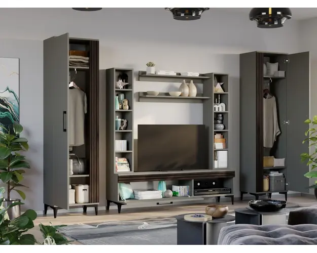 Living Nori C15 - Mobila sufragerie Living Nori C15 - Mobila sufragerie face parte din familia de mobila pentru sufragerie / living Nori . Aceasta colectie este alcatuita din mai multe module, care, prin combinatiile de materiale si culori, denota o eleganta si un rafinament aparte. Puteti alege direct din configuratiile realizate de noi sau, daca doriti, puteti creea singuri propria configuratie de living combinand corpurile de mobila astfel incat sa se potriveasca perfect in spatiul dorit. Livrare gratuita si rapida, 4-10 zile lucratoare prin flota proprie Suntem producatori de mobilier, fara intermediari Toate piesele de mobilier au o garantie de 2 ani Living Nori C15 - Mobila sufragerie Corpurile din gama Living Nori sunt construite din PAL melaminat de 16mm cu finisaj Casmir si Deep Line (cu aspect care imita riflajul) care, impreuna cu manerele si picioarele negre , creeaza un ambient primitor si o atmosfera placuta. Cantul aplicat este unul de 0,6 care le permite muchiilor sa fie placute la atingere. Atentie! Elementele de prindere de tipul dibluri, surub sau horsurub nu sunt incluse deoarce tipul de prindere difera in functie de tipul peretelui pe care urmeaza a se monta mobilierul (beton, caramida, BCA, rigips, lemn etc). Dimensiuni Living Nori C15 Imaginea alaturata prezinta compartimentarea pentru Living Nori C15 - Mobila sufragerie . Aceasta configuratie are 7 corpuri modulare , 4 suspendate si 3 pe sol. Spatii de depozitare cu usa cat si etajere si polite. Dulapurile au bare de haine. Dimensiuni corpuri componente: 2 x Dulap Haine: L 51.6 x A 35.1 x H 192.4 cm - Schita Montaj Comoda TV 1600: L 160 x A 33.5 x H 43.7 cm - Schita Montaj 2 x Corp Decorativ cu Polite: L 120 x A 22 x H 25 cm - Schita Montaj Set 2 Polite Suspendate: L 91.8 x A 18.6 x H 12 cm Schita Montaj Inaltime picioare 12cm, este inclusa in dimensiunile corpurilor si dimensiunea totala. Dimensiuni totale livin L 280 x A 35.1 x H 192.4 cm (inaltimea poate varia in functie de inaltimea pentru care optati atunci cand suspendati corpurile superioare) Spatiul de TV: diagonala recomandata maxima 180cm/70" Toate corpurile se pot pune pe stanga sau pe dreapta in functie de cum doriti. Nu este obligatoriu pozitionarea ca in prezentare. Ele nu sunt prinse unul de celalalt. Pretul afisat nu include alte accesorii sau obiecte de decor (TV, tablouri, elemente de iluminat, covor etc.) Dimensiunile sunt exprimate in cm si pot oscila intre ± 10 mm. Living Nori C15 - Mobila sufragerie se livreaza demontat si este insotit de accesorii si instructiuni de asamblare. Produsul cu denumirea Living Nori C15 - Mobila sufragerie face parte din brandul Mobila laguna, se afla in categoria Mobila living si sufragerii si subcategoria