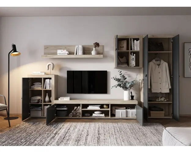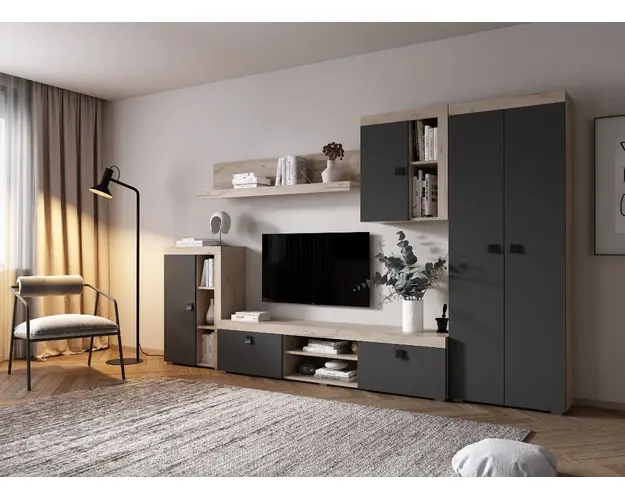 Living Ontario C1 UNO - Mobila sufragerie Living Ontario C1 UNO - Mobila sufragerie are un aspect contemporan / modern si este alcatuita din mai module. Puteti alege direct din configuratiile realizate de noi sau daca doriti puteti creea singuri propria configuratie de living combinand din corpurile de mobila pentru living. In functie de spatiul unde doriti sa amplasati mobila puteti adapta livingul. Livrare gratuita si rapida, 4-10 zile lucratoare prin flota proprie Suntem producatori de mobilier, fara intermediari Toate piesele de mobilier au o garantie de 2 ani Corpurile sunt construite din PAL melaminat de 16mm cu finisaj gri antracit si stejar k02 , cel din urma avand o textura similara lemnului, care creeaza un contrast rafinat si un ambient placut.Cantul aplicat este unul de 0,6 care le permite muchiilor sa fie placute la atingere . Dimensiuni Living Ontario C1 UNO - Mobila sufragerie Imaginea alaturata prezinta compartimentarea pentru mobila de sufragerie Ontario. Aceasta configuratie are 5 corpuri modulare , 2 suspendate si 3 pe sol. Spatii de depozitare cu usa cat si etajere si polita. Dulapul are 2 spatii de depozitare si o bara pentru haine. Poate fi folosit si pentru haine cat si pentru obiecte diverse. Dimensiuni corpuri: Comoda TV: L 180 x A 35.2 x H 39.8 cm Comoda Inalta: L 60 x A 30.4 x H 96.8 cm Dulap 2 usi: L 67.6 x A 30.4 x H 182 cm Corp Suspendat: L 60 x A 30.4 x H 69.8 cm Polita 1390 : L 139 x A 21.6 x H 34.8 cm Dimensiuni totale livin L 307.6 x A 35.2 x H 182 cm Spatiul de TV: diagonala max 126cm/50" (sau mai mare) Recomandam un TV cu o diagonala de maxim 126cm/50". Se pot utiliza si diagonale mai mari mutand corpul suspendat mai in stanga. Toate corpurile se pot pune pe stanga sau pe dreapta in functie de cum doriti. Nu este obligatoriu pozitionarea ca in prezentare. Ele nu sunt prinse unul de celalalt. Info si schite montaj mobila sufragerie Schite de montaj: DESCARCA SCHITA MONTAJ COMODA TV DESCARCA SCHITA MONTAJ COMODA INALTA DESCARCA SCHITA MONTAJ CORP SUSPENADAT DESCARCA SCHITA MONTAJ POLITA DESCARCA SCHITA MONTAJ DULAP Pretul afisat nu include alte accesorii sau obiecte de decor (TV, tablouri, elemente de iluminat, covor etc.) Dimensiunile sunt exprimate in cm si pot oscila intre ± 10 mm. Produsul se livreaza demontat si este insotit de accesorii si instructiuni de asamblare. Produsul cu denumirea Living Ontario C1 UNO - Mobila sufragerie face parte din brandul Mobila laguna, se afla in categoria Mobila living si sufragerii si subcategoria