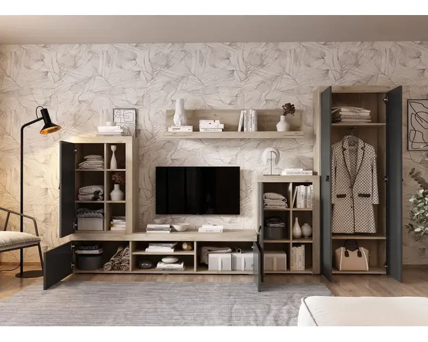 Living Ontario C2 UNO- Mobila sufragerie Living Ontario C2 UNO- Mobila sufragerie are un aspect contemporan / modern si este alcatuita din mai module. Puteti alege direct din configuratiile realizate de noi sau daca doriti puteti creea singuri propria configuratie de living combinand din corpurile de mobila pentru living. In functie de spatiul unde doriti sa amplasati mobila puteti adapta livingul. Livrare gratuita si rapida, 4-10 zile lucratoare prin flota proprie Suntem producatori de mobilier, fara intermediari Toate piesele de mobilier au o garantie de 2 ani Corpurile sunt construite din PAL melaminat de 16mm cu finisaj gri antracit si stejar k02 , cel din urma avand o textura similara lemnului, care creeaza un contrast rafinat si un ambient placut.Cantul aplicat este unul de 0,6 care le permite muchiilor sa fie placute la atingere . Dimensiuni Living Ontario C2 UNO- Mobila sufragerie Imaginea alaturata prezinta compartimentarea pentru mobila de sufragerie Ontario. Aceasta configuratie are 5 corpuri modulare , 1 suspendat si 4 pe sol. Spatii de depozitare cu usa cat si etajere si polita. Dulapul are 2 spatii de depozitare si o bara pentru haine. Poate fi folosit si pentru haine cat si pentru obiecte diverse. Dimensiuni corpuri: Comoda TV: L 180 x A 35.2 x H 39.8 cm Comoda Inalta x 2 buc: L 60 x A 30.4 x H 96. 8 cm Dulap 2 usi: L 67.6 x A 30.4 x H 182 cm Polita 1390 : L 139 x A 21.6 x H 34.8 cm Dimensiuni totale livin L 307.6 x A 35.2 x H 182 cm Spatiul de TV: diagonala max 126cm/50" (sau mai mare) Recomandam un TV cu o diagonala de maxim 126cm/50". Se pot utiliza si diagonale mai mari mutand corpurile in alte pozitii. Toate corpurile se pot pune pe stanga sau pe dreapta in functie de cum doriti. Nu este obligatoriu pozitionarea ca in prezentare. Ele nu sunt prinse unul de celalalt. Info si schite montaj mobila sufragerie Schite de montaj: DESCARCA SCHITA MONTAJ COMODA TV DESCARCA SCHITA MONTAJ COMODA INALTA DESCARCA SCHITA MONTAJ POLITA DESCARCA SCHITA MONTAJ DULAP Pretul afisat nu include alte accesorii sau obiecte de decor (TV, tablouri, elemente de iluminat, covor etc.) Dimensiunile sunt exprimate in cm si pot oscila intre ± 10 mm. Produsul se livreaza demontat si este insotit de accesorii si instructiuni de asamblare. Produsul cu denumirea Living Ontario C2 UNO - Mobila sufragerie face parte din brandul Mobila laguna, se afla in categoria Mobila living si sufragerii si subcategoria