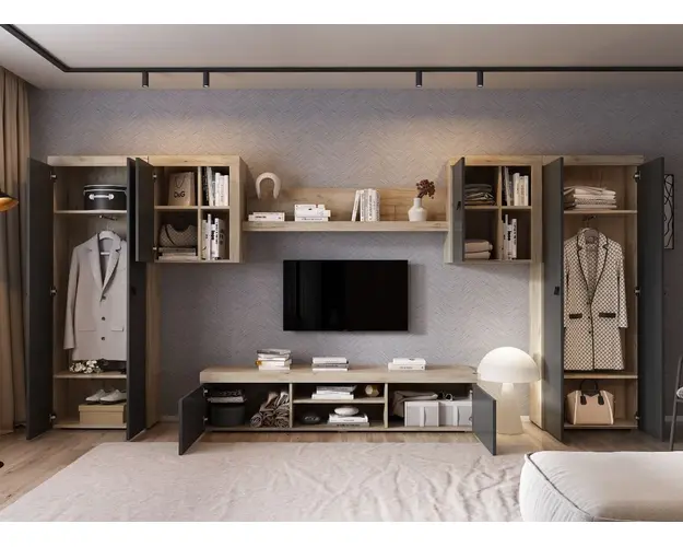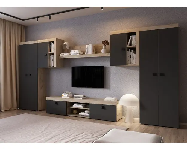 Living Ontario C3 DUO - Mobila sufragerie Living Ontario C3 DUO - Mobila sufragerie are un aspect contemporan / modern si este alcatuita din mai module. Puteti alege direct din configuratiile realizate de noi sau daca doriti puteti creea singuri propria configuratie de living combinand din corpurile de mobila pentru living. In functie de spatiul unde doriti sa amplasati mobila puteti adapta livingul. Livrare gratuita si rapida, 4-10 zile lucratoare prin flota proprie Suntem producatori de mobilier, fara intermediari Toate piesele de mobilier au o garantie de 2 ani Corpurile sunt construite din PAL melaminat de 16mm cu finisaj gri antracit si stejar k02 , cel din urma avand o textura similara lemnului, care creeaza un contrast rafinat si un ambient placut.Cantul aplicat este unul de 0,6 care le permite muchiilor sa fie placute la atingere . Dimensiuni Living Ontario C3 DUO - Mobila sufragerie Imaginea alaturata prezinta compartimentarea pentru mobila de sufragerie Ontario. Aceasta configuratie are 6 corpuri modulare , 3 suspendate si 3 pe sol. Spatii de depozitare cu usa cat si etajere si polita. Dulapurile au 2 spatii de depozitare si o bara pentru haine. Pot fi folosite si pentru haine cat si pentru obiecte diverse. Dimensiuni corpuri: Comoda TV: L 180 x A 35.2 x H 39.8 cm Corp Suspendat x 2 buc: L 60 x A 30.4 x H 69.8 cm Polita 1390 : L 139 x A 21.6 x H 34.8 cm Dulap 2 usi x 2 buc: L 67.6 x A 30.4 x H 182 cm Dimensiuni totale livin L 394.2 x A 35.2 x H 182 cm Spatiul de TV: diagonala max 126cm/50" (sau mai mare) Recomandam un TV cu o diagonala de maxim 126cm/50". Se pot utiliza si diagonale mai mari mutand corpurile suspendate mai sus. Toate corpurile se pot pune pe stanga sau pe dreapta in functie de cum doriti. Nu este obligatoriu pozitionarea ca in prezentare. Ele nu sunt prinse unul de celalalt. Info si schite montaj mobila sufragerie Schite de montaj: DESCARCA SCHITA MONTAJ COMODA TV DESCARCA SCHITA MONTAJ CORP SUSPENADAT DESCARCA SCHITA MONTAJ POLITA DESCARCA SCHITA MONTAJ DULAP Pretul afisat nu include alte accesorii sau obiecte de decor (TV, tablouri, elemente de iluminat, covor etc.) Dimensiunile sunt exprimate in cm si pot oscila intre ± 10 mm. Produsul se livreaza demontat si este insotit de accesorii si instructiuni de asamblare. Produsul cu denumirea Living Ontario C3 DUO - Mobila sufragerie face parte din brandul Mobila laguna, se afla in categoria Mobila living si sufragerii si subcategoria
