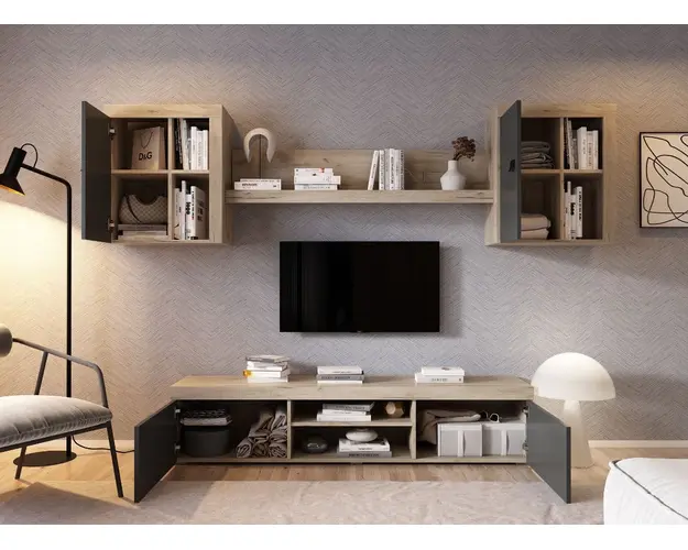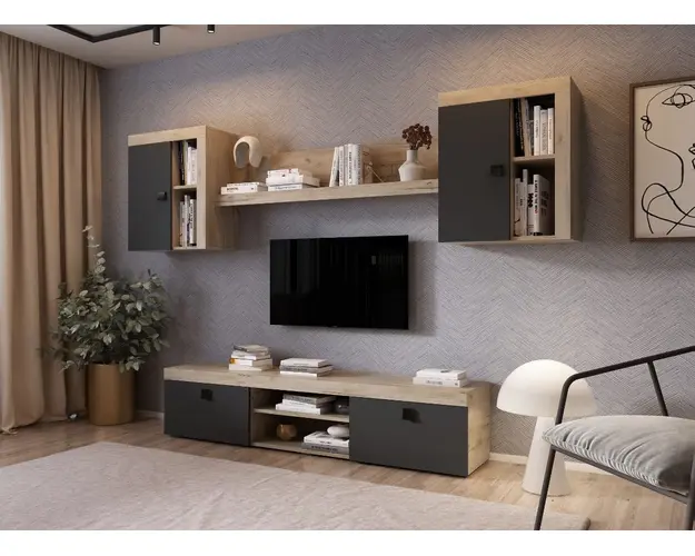 Living Ontario C3 - Mobila sufragerie Living Ontario C3 - Mobila sufragerie are un aspect contemporan / modern si este alcatuita din mai module. Puteti alege direct din configuratiile realizate de noi sau daca doriti puteti creea singuri propria configuratie de living combinand din corpurile de mobila pentru living. In functie de spatiul unde doriti sa amplasati mobila puteti adapta livingul. Livrare gratuita si rapida, 4-10 zile lucratoare prin flota proprie Suntem producatori de mobilier, fara intermediari Toate piesele de mobilier au o garantie de 2 ani Corpurile sunt construite din PAL melaminat de 16mm cu finisaj gri antracit si stejar k02 , cel din urma avand o textura similara lemnului, care creeaza un contrast rafinat si un ambient placut.Cantul aplicat este unul de 0,6 care le permite muchiilor sa fie placute la atingere . Dimensiuni Living Ontario C3 - Mobila sufragerie Imaginea alaturata prezinta compartimentarea pentru mobila de sufragerie Ontario. Aceasta configuratie are 4 corpuri modulare , 3 suspendate si 1 pe sol. Spatii de depozitare cu usa cat si etajere si polita. Dimensiuni corpuri: Comoda TV: L 180 x A 35.2 x H 39.8 cm Corp Suspendat x 2 buc: L 60 x A 30.4 x H 69.8 cm Polita 1390 : L 139 x A 21.6 x H 34.8 cm Dimensiuni totale livin L 259 x A 35.2 x H 182 cm Spatiul de TV: diagonala max 126cm/50" (sau mai mare) Recomandam un TV cu o diagonala de maxim 126cm/50". Se pot utiliza si diagonale mai mari mutand corpurile suspendate mai sus. Toate corpurile se pot pune pe stanga sau pe dreapta in functie de cum doriti. Nu este obligatoriu pozitionarea ca in prezentare. Ele nu sunt prinse unul de celalalt. Info si schite montaj mobila sufragerie Schite de montaj: DESCARCA SCHITA MONTAJ COMODA TV DESCARCA SCHITA MONTAJ CORP SUSPENADAT DESCARCA SCHITA MONTAJ POLITA Pretul afisat nu include alte accesorii sau obiecte de decor (TV, tablouri, elemente de iluminat, covor etc.) Dimensiunile sunt exprimate in cm si pot oscila intre ± 10 mm. Produsul se livreaza demontat si este insotit de accesorii si instructiuni de asamblare. Produsul cu denumirea Living Ontario C3 - Mobila sufragerie face parte din brandul Mobila laguna, se afla in categoria Mobila living si sufragerii si subcategoria