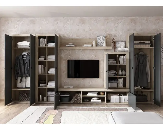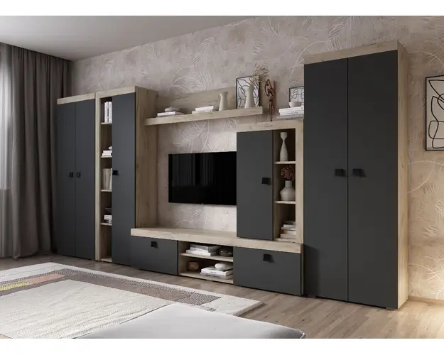 Living Ontario C4 DUO - Mobila sufragerie Living Ontario C4 DUO - Mobila sufragerie are un aspect contemporan / modern si este alcatuita din mai module. Puteti alege direct din configuratiile realizate de noi sau daca doriti puteti creea singuri propria configuratie de living combinand din corpurile de mobila pentru living. In functie de spatiul unde doriti sa amplasati mobila puteti adapta livingul. Livrare gratuita si rapida, 4-10 zile lucratoare prin flota proprie Suntem producatori de mobilier, fara intermediari Toate piesele de mobilier au o garantie de 2 ani Corpurile sunt construite din PAL melaminat de 16mm cu finisaj gri antracit si stejar k02 , cel din urma avand o textura similara lemnului, care creeaza un contrast rafinat si un ambient placut.Cantul aplicat este unul de 0,6 care le permite muchiilor sa fie placute la atingere . Dimensiuni Living Ontario C4 DUO - Mobila sufragerie Imaginea alaturata prezinta compartimentarea pentru mobila de sufragerie Ontario. Aceasta configuratie are 6 corpuri modulare , 1 suspendat si 5 pe sol. Spatii de depozitare cu usa cat si etajere si polita. Dulapurile au 2 spatii de depozitare si o bara pentru haine. Pot fi folosite si pentru haine cat si pentru obiecte diverse. Dimensiuni corpuri: Comoda TV: L 180 x A 35.2 x H 39.8 cm Comoda Inalta: L 60 x A 30.4 x H 96.8 cm Soldat 1 usa: L 60 x A 30.4 x H 182 cm Polita 1390 : L 139 x A 21.6cm x H 34.8 cm Dulap 2 usi x 2 buc: L 67.6 x A 30.4 xH 182 cm Dimensiuni totale livin L 375.2 x A 35.2 x H 182 cm Spatiul de TV: diagonala max 126cm/50″ (sau mai mare) Recomandam un TV cu o diagonala de maxim 126cm/50″. Se pot pune si TV-uri cu diagonala mai mare mutand corpul comoda inalta. Toate corpurile se pot pune pe stanga sau pe dreapta in functie de cum doriti. Nu este obligatoriu pozitionarea ca in prezentare. Ele nu sunt prinse unul de celalalt. Info si schite montaj mobila sufragerie Schite de montaj: DESCARCA SCHITA MONTAJ COMODA TV DESCARCA SCHITA MONTAJ COMODA INALTA DESCARCA SCHITA MONTAJ SOLDAT 1 USA DESCARCA SCHITA MONTAJ POLITA DESCARCA SCHITA MONTAJ DULAP Pretul afisat nu include alte accesorii sau obiecte de decor (TV, tablouri, elemente de iluminat, covor etc.) Dimensiunile sunt exprimate in cm si pot oscila intre ± 10 mm. Produsul se livreaza demontat si este insotit de accesorii si instructiuni de asamblare. Produsul cu denumirea Living Ontario C4 DUO - Mobila sufragerie face parte din brandul Mobila laguna, se afla in categoria Mobila living si sufragerii si subcategoria