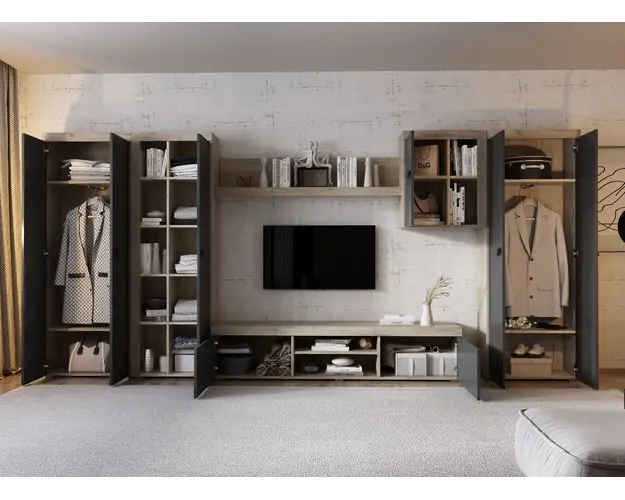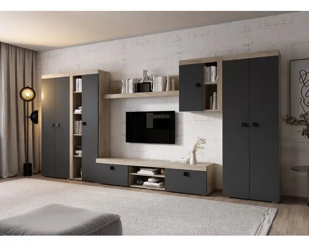 Living Ontario C5 DUO - Mobila sufragerie Living Ontario C5 DUO - Mobila sufragerie are un aspect contemporan / modern si este alcatuita din mai module. Puteti alege direct din configuratiile realizate de noi sau daca doriti puteti creea singuri propria configuratie de living combinand din corpurile de mobila pentru living. In functie de spatiul unde doriti sa amplasati mobila puteti adapta livingul. Livrare gratuita si rapida, 4-10 zile lucratoare prin flota proprie Suntem producatori de mobilier, fara intermediari Toate piesele de mobilier au o garantie de 2 ani Corpurile sunt construite din PAL melaminat de 16mm cu finisaj gri antracit si stejar k02 , cel din urma avand o textura similara lemnului, care creeaza un contrast rafinat si un ambient placut.Cantul aplicat este unul de 0,6 care le permite muchiilor sa fie placute la atingere . Dimensiuni Living Ontario C5 DUO - Mobila sufragerie Imaginea alaturata prezinta compartimentarea pentru mobila de sufragerie Ontario. Aceasta configuratie are 6 corpuri modulare , 2 suspendate si 4 pe sol. Spatii de depozitare cu usa cat si etajere si polita. Dulapurile au cate 2 spatii de depozitare si o bara pentru haine. Pot fi folosite si pentru haine cat si pentru obiecte diverse. Dimensiuni corpuri: Comoda TV: L 180 x A 35.2 x H 39.8 cm Soldat 1 usa: L 60 x A 30.4 x H 182 cm Dulap 2 usi x 2 buc: L 67.6 x A 30.4 x H 182 cm Corp Suspendat: L 60 x A 30.4 x H 69.8 cm Polita 1390 : L 139 x A 21.6 x H 34.8 cm Dimensiuni totale livin L 394.2 x A 35.2 x H 182 cm Spatiul de TV: diagonala max 150cm/59″ (sau mai mare) Recomandam un TV cu o diagonala de maxim 150cm/59″. Se pot pune si TV-uri cu diagonala mai mare mutand corpul suspendat mai in stanga livingului sau mai sus. Toate corpurile se pot pune pe stanga sau pe dreapta in functie de cum doriti. Nu este obligatoriu pozitionarea ca in prezentare. Ele nu sunt prinse unul de celalalt. Info si schite montaj mobila sufragerie Schite de montaj: DESCARCA SCHITA MONTAJ COMODA TV DESCARCA SCHITA MONTAJ SOLDAT 1 USA DESCARCA SCHITA MONTAJ POLITA DESCARCA SCHITA MONTAJ CORP SUSPENDAT DESCARCA SCHITA MONTAJ DULAP Pretul afisat nu include alte accesorii sau obiecte de decor (TV, tablouri, elemente de iluminat, covor etc.) Dimensiunile sunt exprimate in cm si pot oscila intre ± 10 mm. Produsul se livreaza demontat si este insotit de accesorii si instructiuni de asamblare. Produsul cu denumirea Living Ontario C5 DUO - Mobila sufragerie face parte din brandul Mobila laguna, se afla in categoria Mobila living si sufragerii si subcategoria